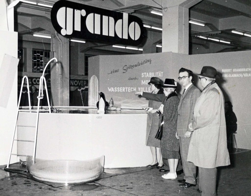 This marked Grando’s entry into pool construction. The first products were small paddling pools, followed by portable swimming pools made from hardboard panels. In 1960, Robert Granderath presented these pools at the SPOGA trade fair, where they attracted significant attention and commercial success.