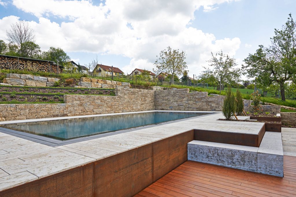 The homeowners’ pool is positioned slightly higher. From the house entrance, Corten steel raised beds lead via a staircase down to the pool terrace, which is paved with bright, rustic natural stone. At the center lies a 12.1 × 4.7 meter entry-level pool from RivieraPool.