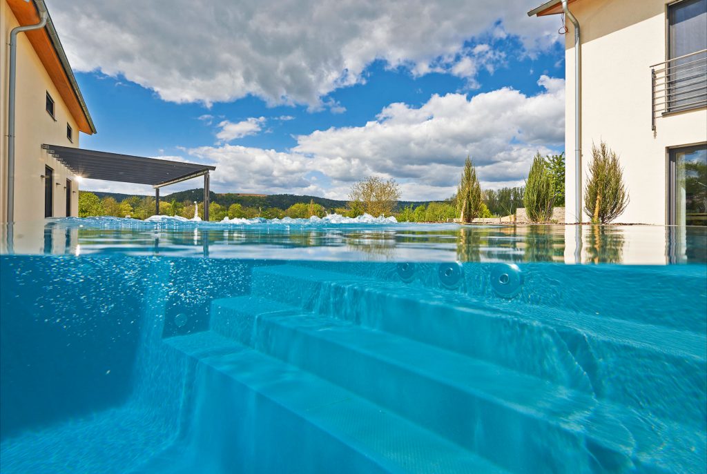 On a spacious hillside property in the Bavarian town of Tauberbischofsheim, Höhlein Schwimmbad & Wellness created this extraordinary pool landscape. It was designed not only for the homeowners but also for the family dog, which has its own area. The four-legged family member can exercise in a foil-lined water channel measuring two meters wide and almost 30 meters long that runs through the garden.