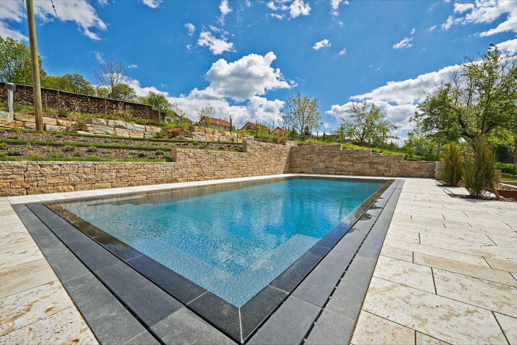 The pool is framed by dark natural stone, which also covers the overflow channel surrounding the pool. This creates a striking contrast and an intense, deep blue water appearance. A staircase running across the entire width of the pool leads into the water.