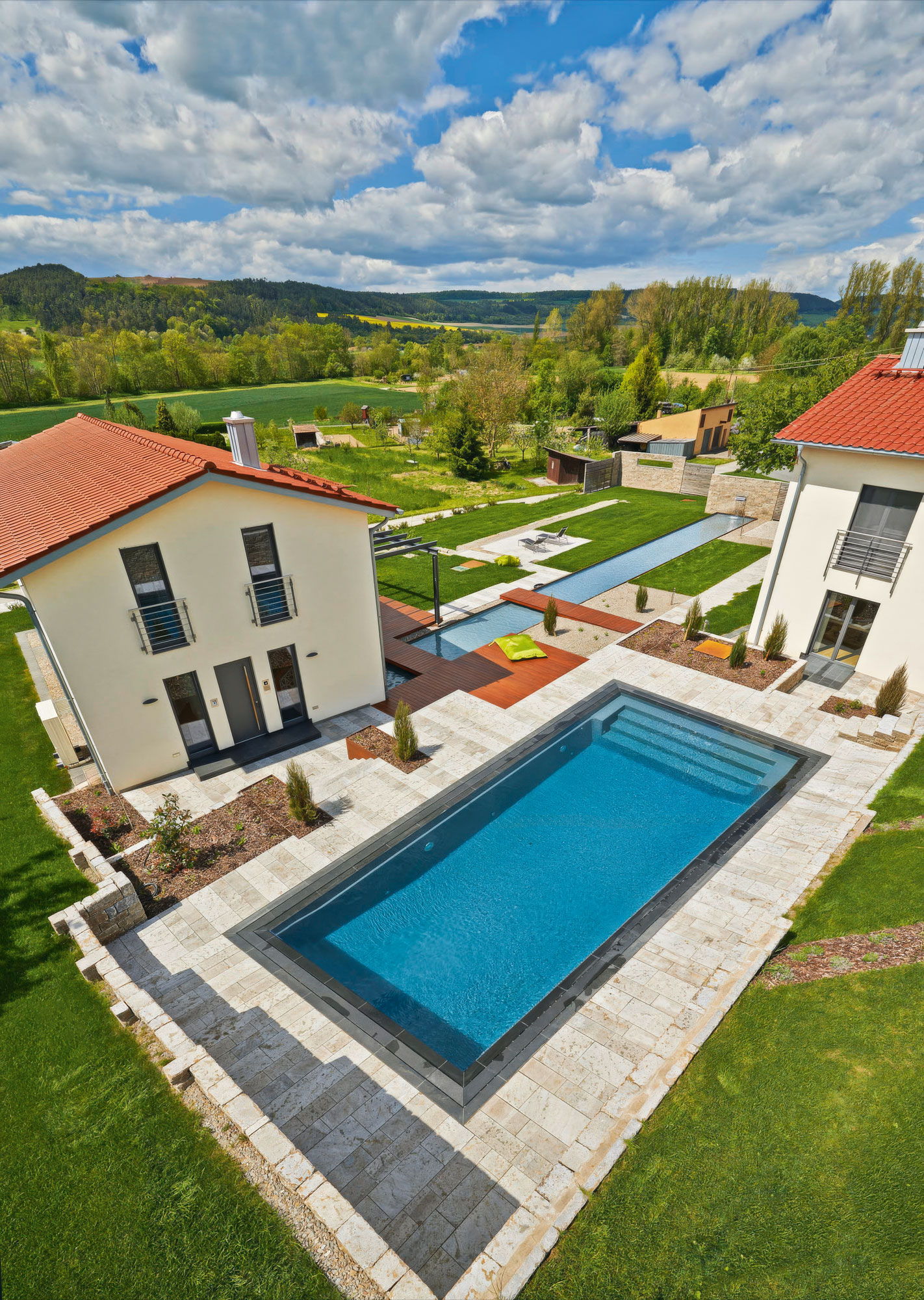 On a spacious hillside property in the Bavarian town of Tauberbischofsheim, Höhlein Schwimmbad & Wellness created this extraordinary pool landscape. It was designed not only for the homeowners but also for the family dog, which has its own area. The four-legged family member can exercise in a foil-lined water channel measuring two meters wide and almost 30 meters long that runs through the garden.