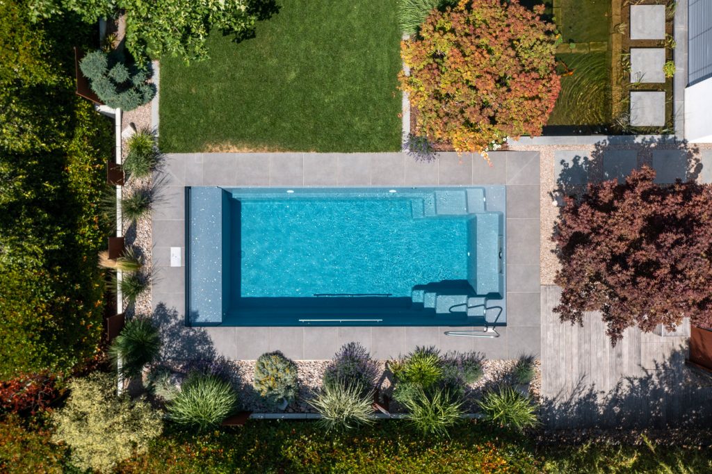 The homeowners’ pool is positioned slightly higher. From the house entrance, Corten steel raised beds lead via a staircase down to the pool terrace, which is paved with bright, rustic natural stone. At the center lies a 12.1 × 4.7 meter entry-level pool from RivieraPool.
