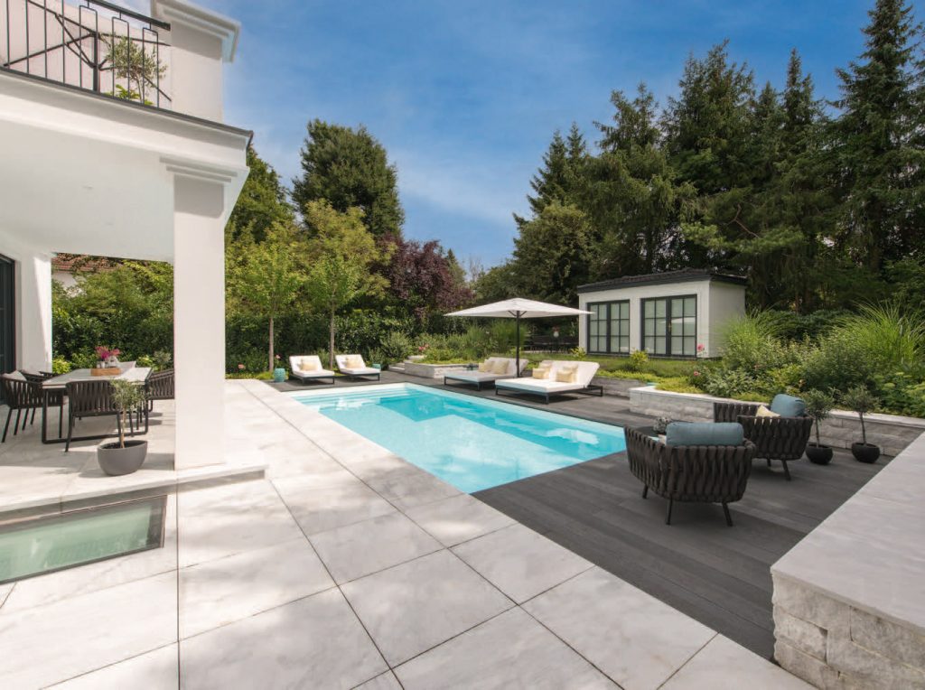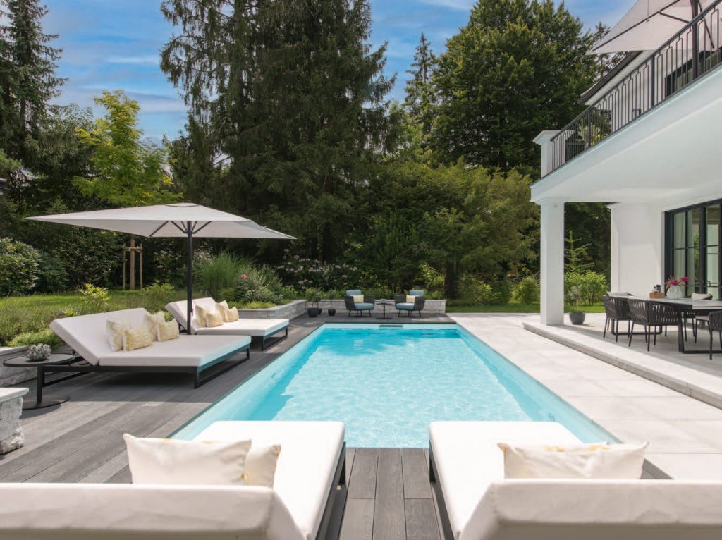 In the garden of a neoclassical villa in Munich, A1-Schwimmbadbau created a pool that unites refined aesthetics with everyday enjoyment. Seamlessly aligned with the geometry of the terrace, the pool forms a harmonious continuation of the architecture.