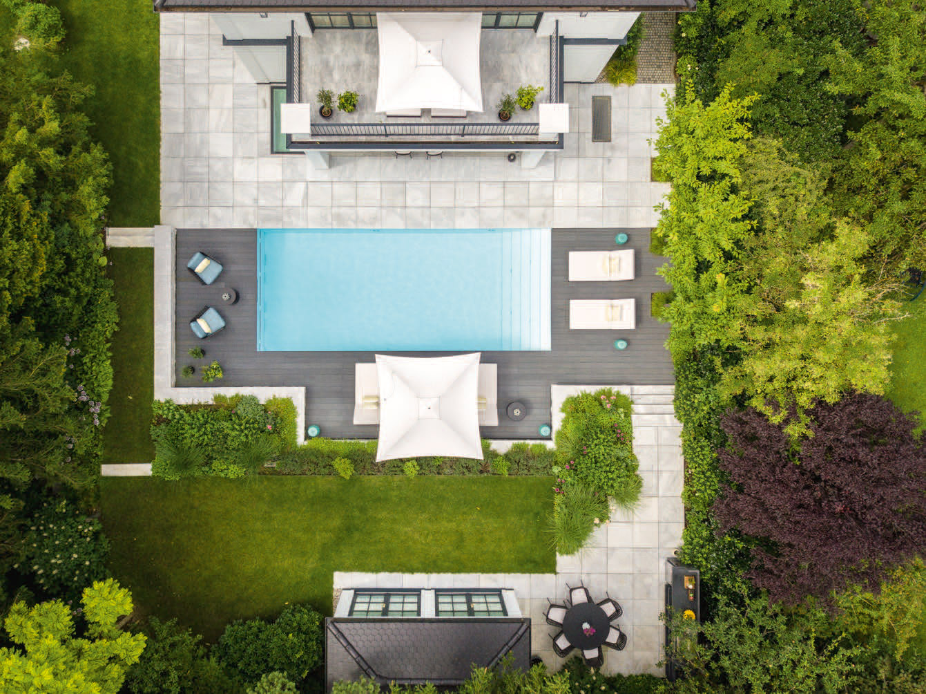 Heated for year-round use, the pool remains inviting even in winter. With its discreet roller cover and precise detailing, it represents timeless craftsmanship and contemporary outdoor living.