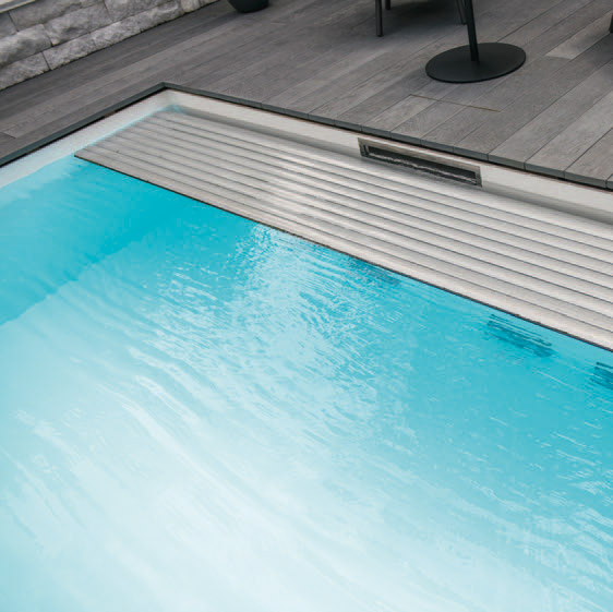 The automatic roller cover is hidden beneath the ultra-flat surface skimmer. It retracts into an underground shaft attached to the pool, leaving the water surface completely clear and undisturbed.