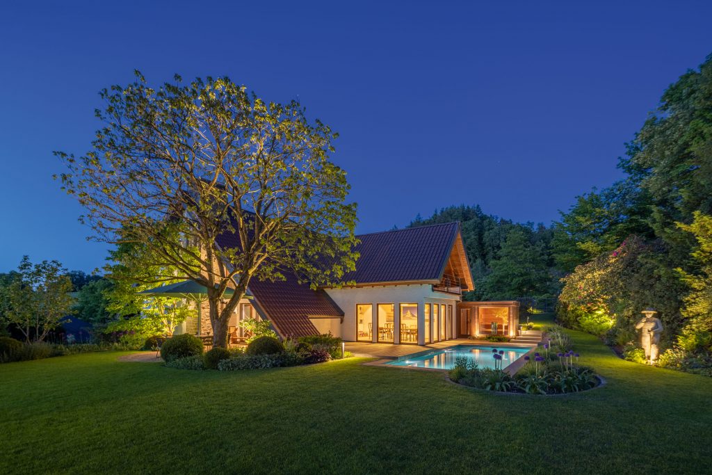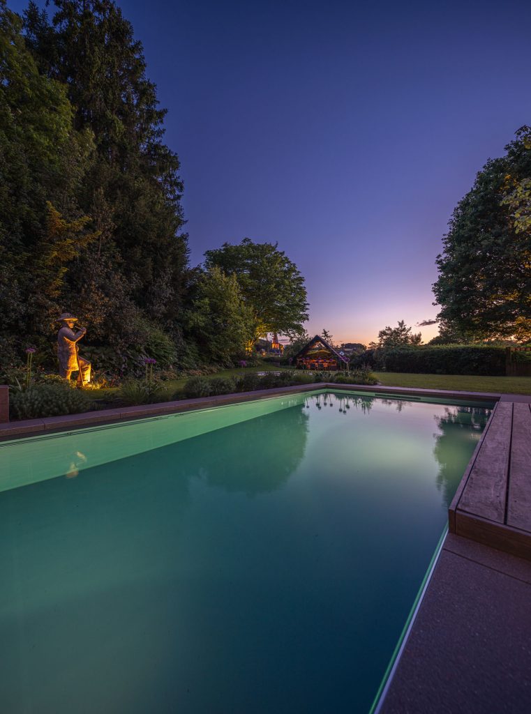 In the evening hours, the underwater lighting of the pool blends seamlessly with the garden lighting. The color of the underwater spotlights can be individually adjusted to any tone, depending on mood and preference.