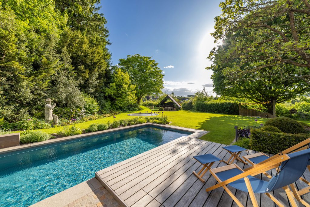 Rich planting surrounds the pool area. Particularly striking are the large rhododendrons, whose vibrant blooms announce the arrival of summer. On the opposite side, the pool opens toward a wide view of the nearby village, where the sunset can be enjoyed from the pool deck.
