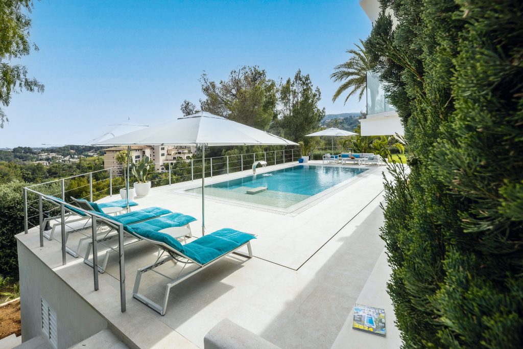As space for the swimming pool was limited, it was designed as an extension of the terrace, using large-format concrete slabs measuring 240 × 60 centimeters. These create a generous terrace area and allow for a floating stepping-stone path across the water surface, leading to a covered ebony wooden deck.