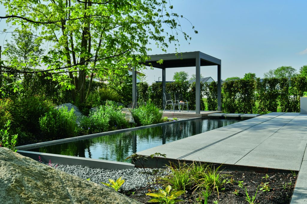 The stepping-stone path divides the foil-lined concrete pool into two zones: one deeper section for swimming and a shallow area with decorative aquatic plants. Water purification is achieved through a natural pool filter system.