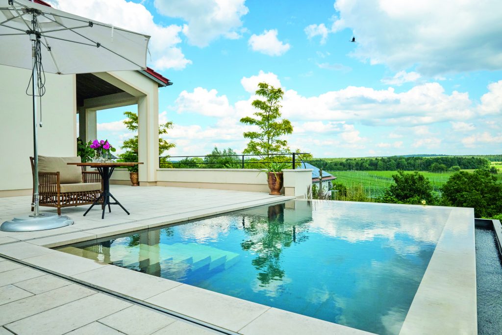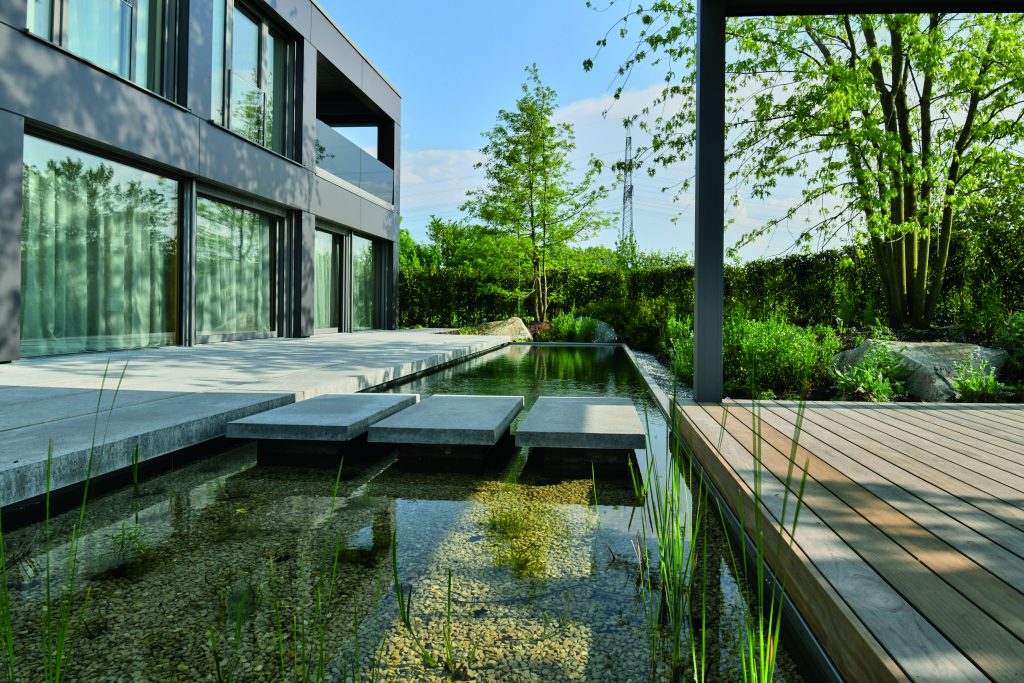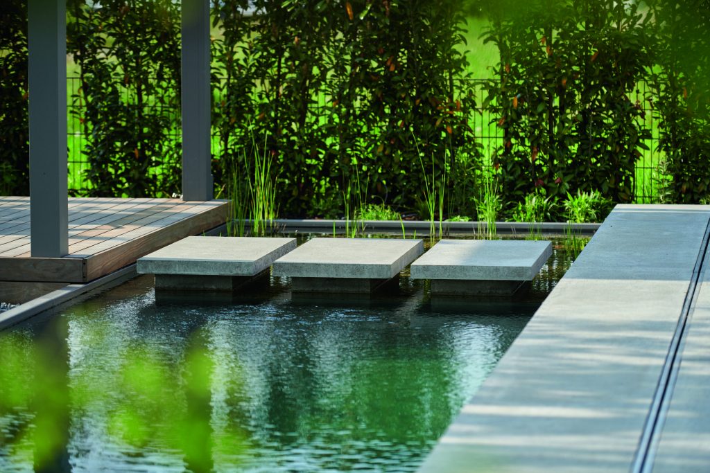 Walking across the water is easy thanks to the large stepping stones. They were coordinated with the terrace paving and cleverly conceal the transition between the swimming area and the planted water zone of the natural pool.