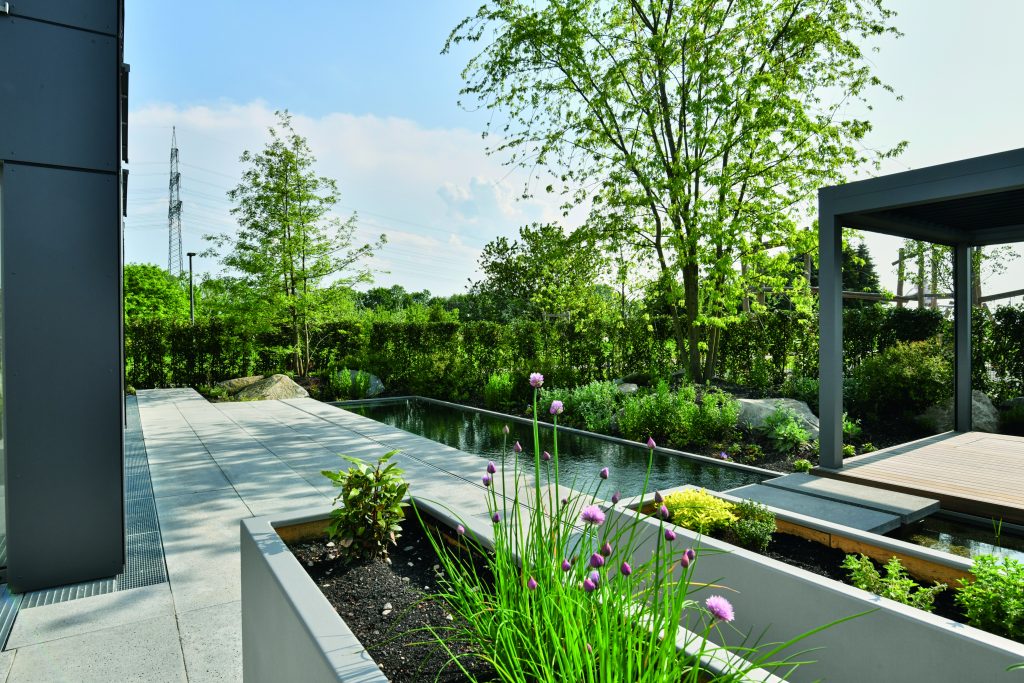 The garden is enclosed by a hornbeam hedge, creating a calm and private atmosphere. The planting concept continues onto the terrace as well, where raised beds made of coated stainless steel provide additional greenery.