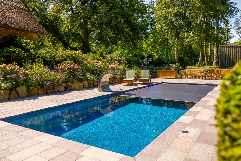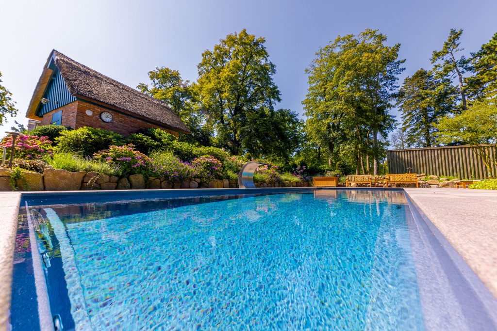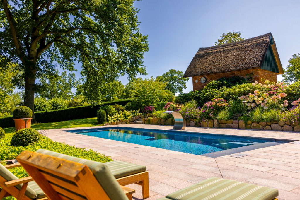 On a country estate nestled within the natural park landscape of Holstein Switzerland in Schleswig-Holstein, a new garden pool was created that blends harmoniously into the historic setting.