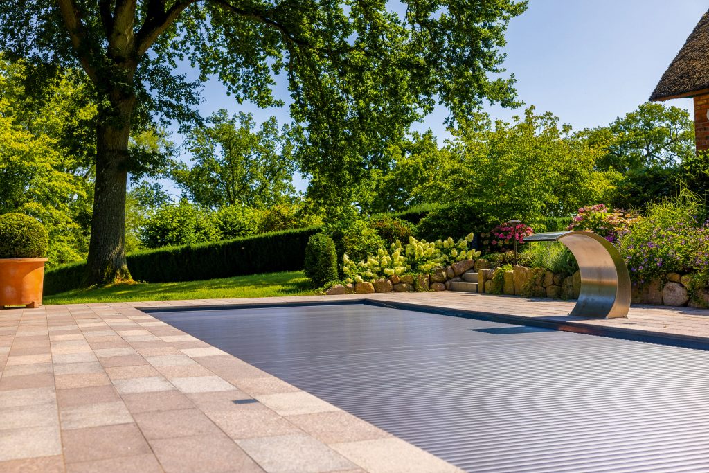 Visually, the cover integrates perfectly into the overall design with its anthracite-colored finish and elegant 3D surface effect, complementing the pool’s Nova Anthrazit color scheme.