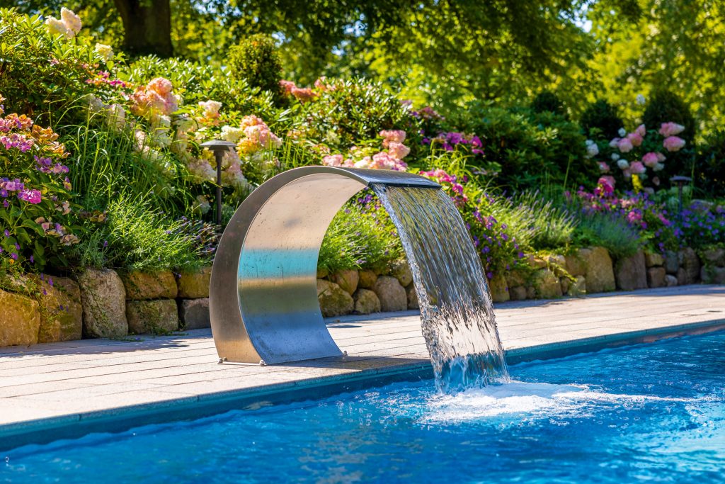 Thanks to the careful placement of all elements, the pool integrates both functionally and aesthetically into the garden landscape.