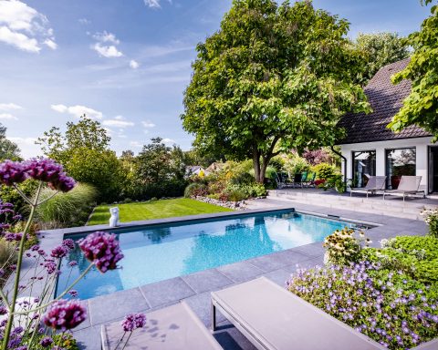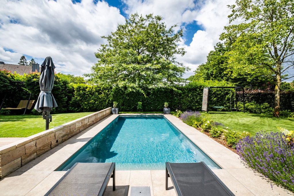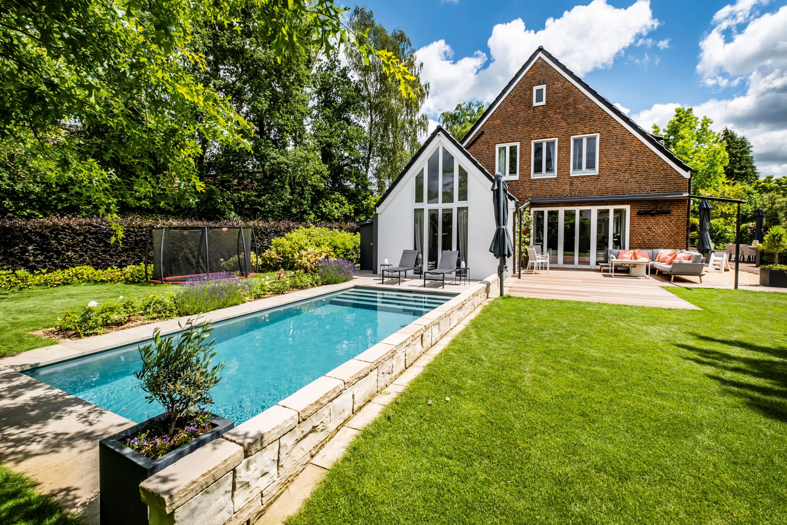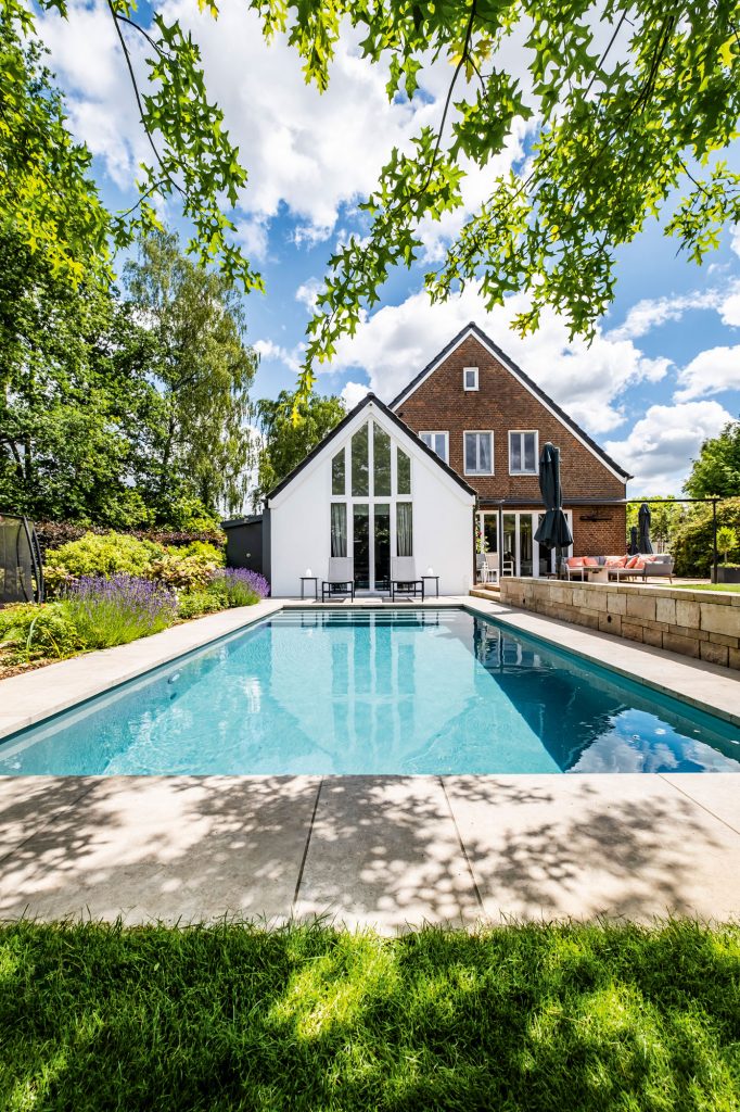 The specialists at Pools & Ponds designed a concept that divides the garden into different functional zones. The new high-level pool is positioned centrally on the terrace area, connecting the various spaces within the garden.