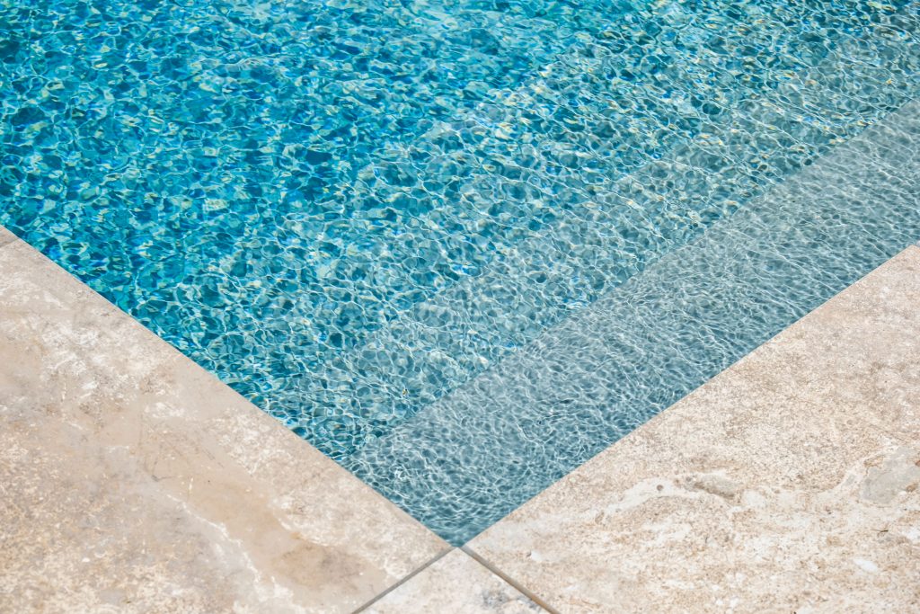 Thanks to the high-level pool design, the water level sits just about three centimeters below the pool edge— a visually elegant and refined solution.