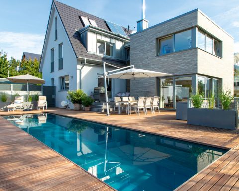 From early morning to late evening, the pool area serves as a central meeting point for the family—especially in the evening hours, when they gather by the water and enjoy the calm atmosphere enhanced by subtle LED lighting.