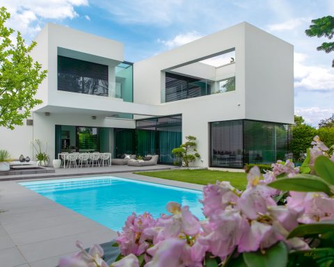 The pool’s proportions were carefully aligned with the width of the house, maintaining a consistent architectural line. While one long side is bordered by a generous flower bed that enhances the swimming experience, the slightly elevated garden area on the opposite side is separated by a low wall made of light natural stone blocks.