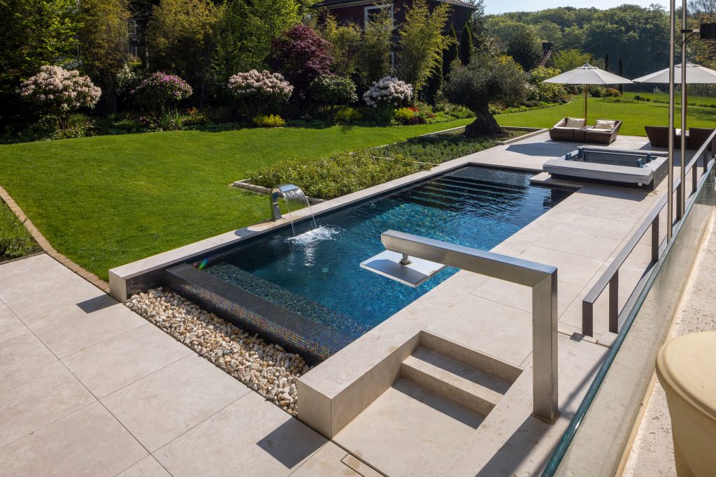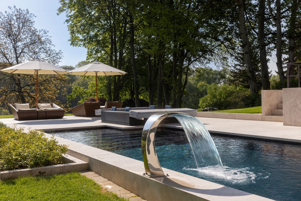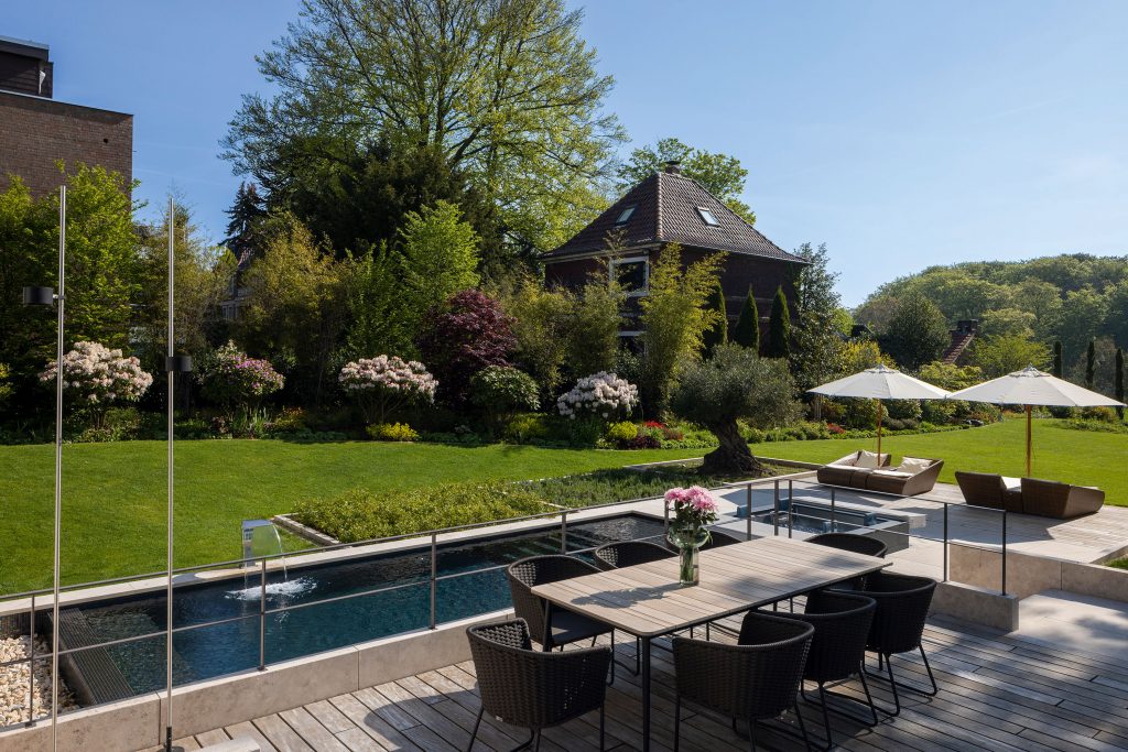 In front of an impressive new-build residence in Düsseldorf, this pool created by Marco Weidner Schwimmbadtechnik forms the perfect link between the house and the garden landscape.