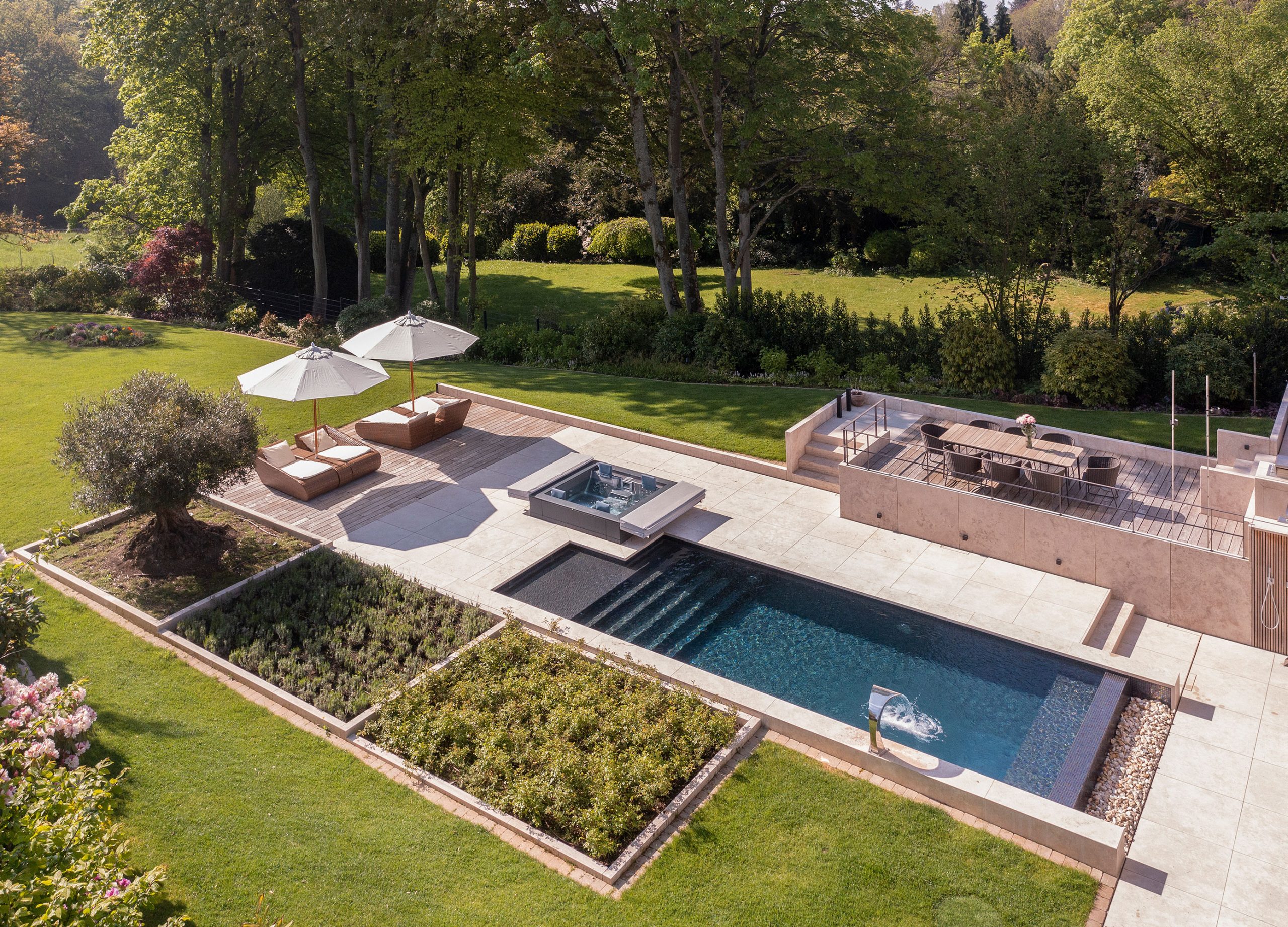 The terrace on the basement level leads directly into a stone bed, into which the pool water gently flows via a mosaic-lined overflow edge. Slightly elevated, the actual pool area presents itself with a generously sized swimming pool and an adjoining whirlpool.