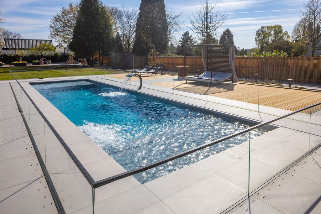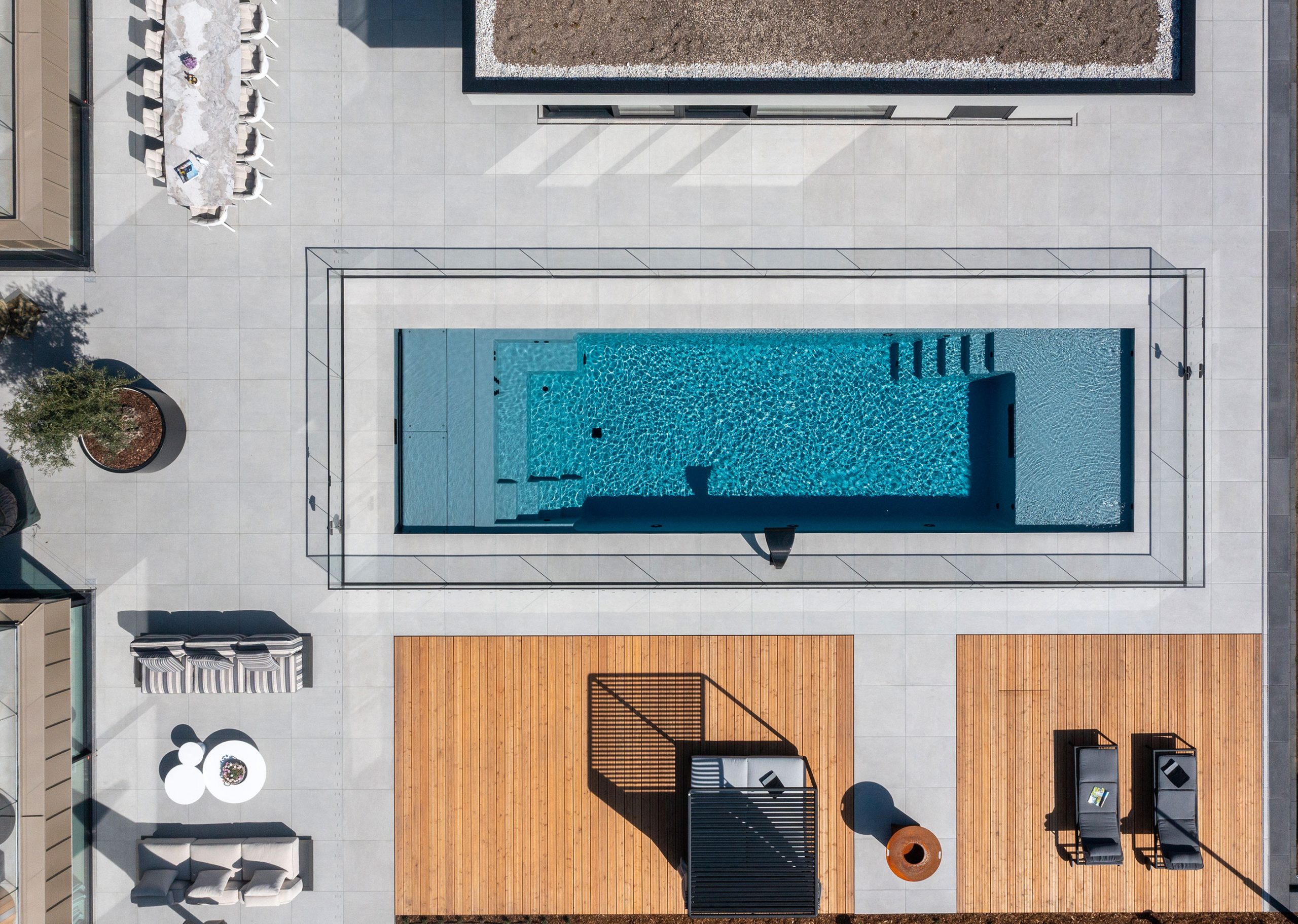 For the young family, child safety was the top priority. Although the swimming pool features a support ledge for the slatted cover, a glass fence was also installed around the pool—serving as a transparent design highlight.