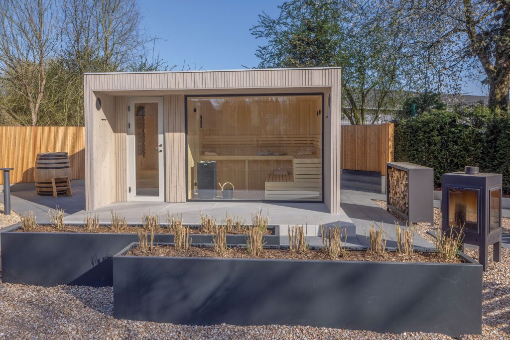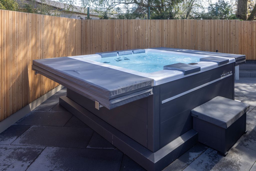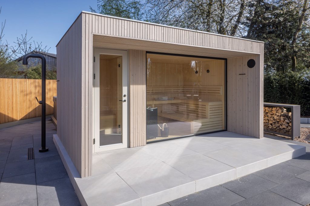 The wellness garden is rounded off by an exclusive garden sauna house and a freestanding hot tub—the five-seat Portable Spa Strato 2.4 from RivieraPool—offering additional comfort and relaxation within a compact space.