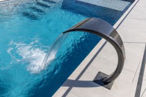 For more active use, the pool is equipped with a Stream Pro turbine counter-current system from Eva. It generates a powerful, wide-flowing current that extends across the entire swimming area—ideal for both leisure swimmers and more ambitious training sessions. The features are further enhanced by a high-performance hydromassage system and a carbon cascade shower by Fluvo, which serves as both a visual highlight and an effective massage for the neck, shoulders, and upper body.