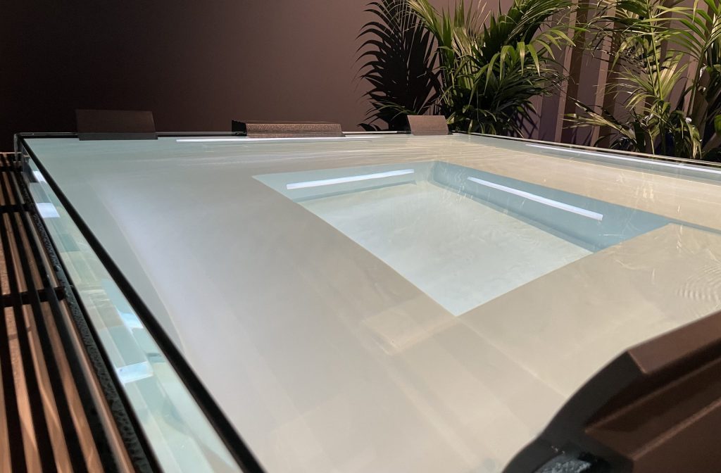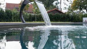 The dark carbon waterfall feature rises in a perfectly shaped arc above the edge of the exposed concrete pool, soothing tired neck muscles after swimming with powerful water massages.