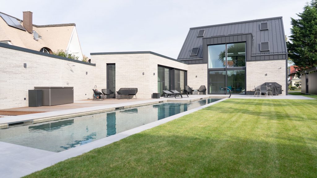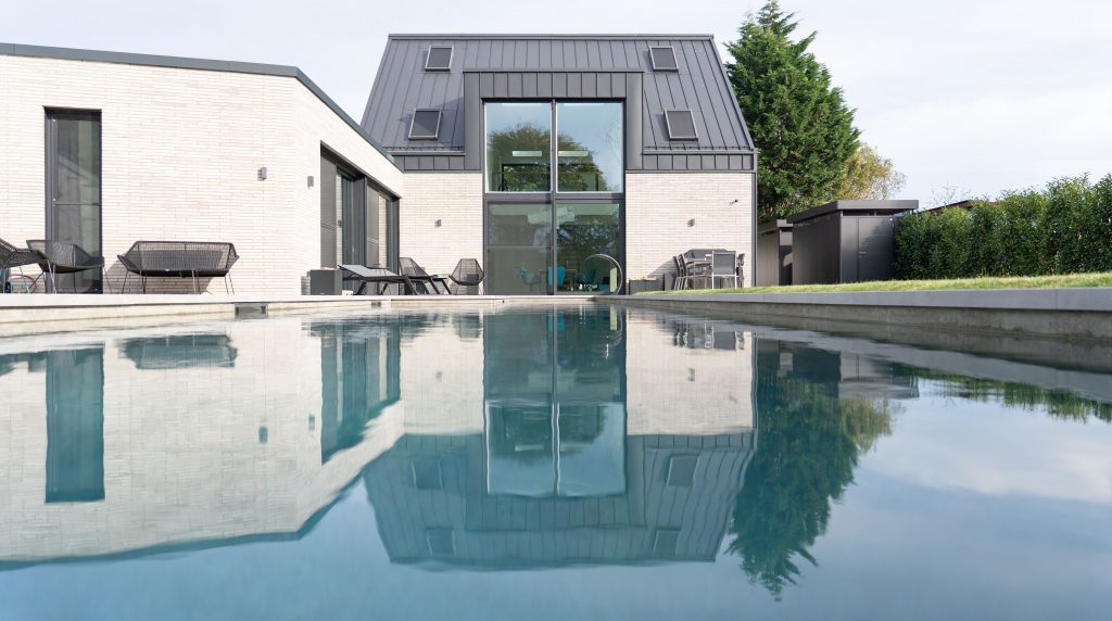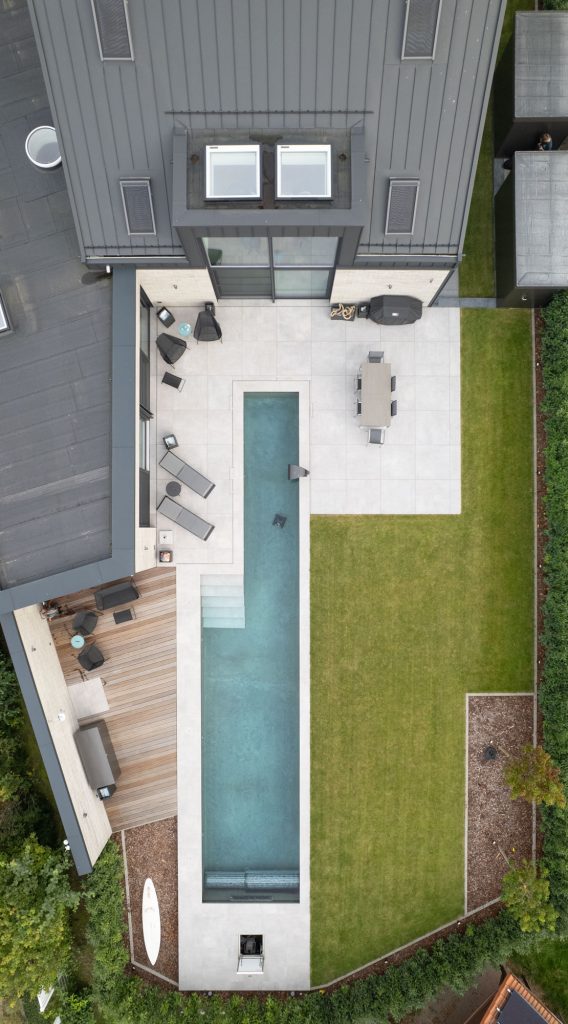 The modern architectural design of the house is enhanced by the pool’s purist exposed concrete finish and its central placement along the property’s axis. From a construction standpoint, the project posed challenges, as the site lies directly behind a dike and is affected by temporary groundwater reaching up to the lawn level. An 85-centimeter-thick solid base slab prevents the empty pool from lifting due to buoyancy.