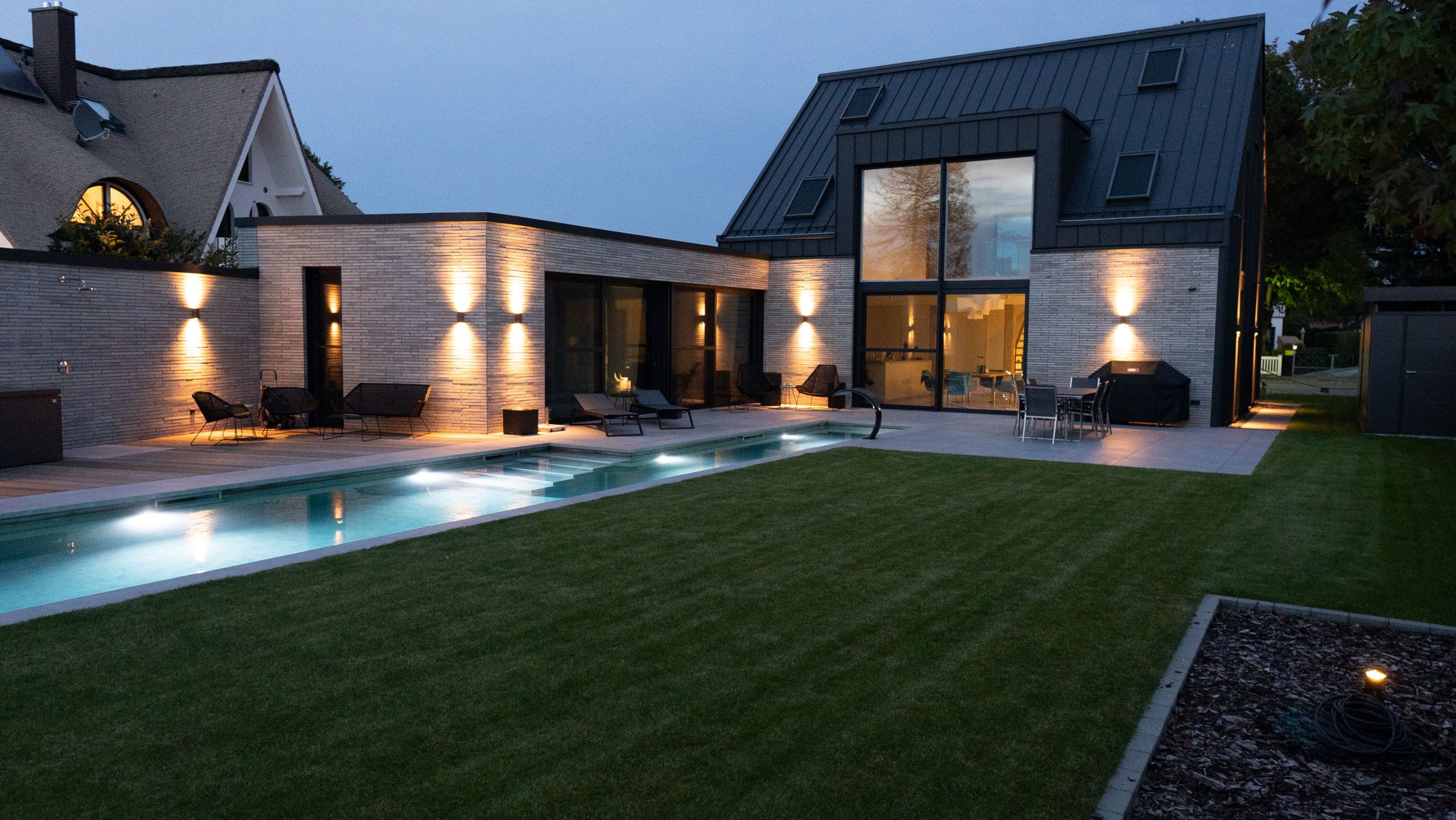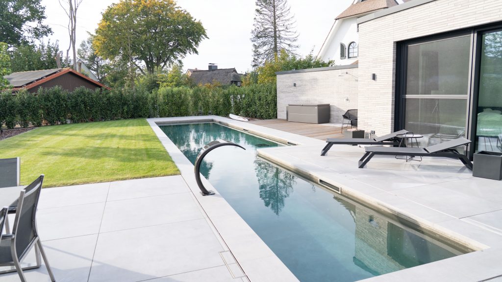 The pool’s design concept is tailored to the slightly trapezoidal shape of the plot. As a central yet visually protected element, it skillfully connects the main house and the north wing into one cohesive ensemble. Rambow Pooldesign also developed a low-energy concept for the installation, integrating energy-efficient components. These include high-quality insulation, a solar-powered slatted cover, and a heat pump with smart photovoltaic integration—turning the pool into an energy storage system.