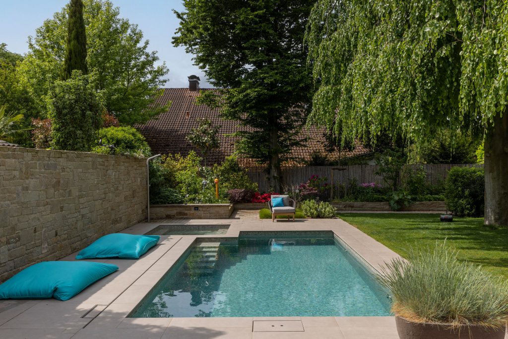 The lovingly designed garden of a brick house in Bochum was transformed by Marco Weidner Schwimmbadtechnik into a comfortable wellness area – featuring two pools.