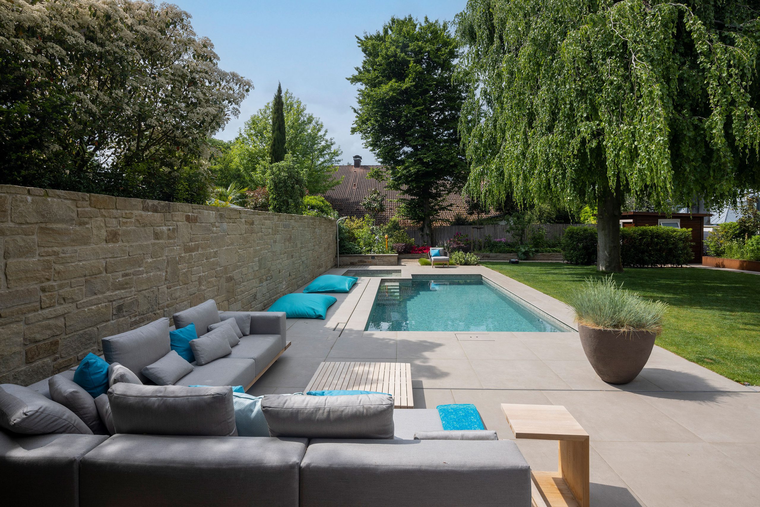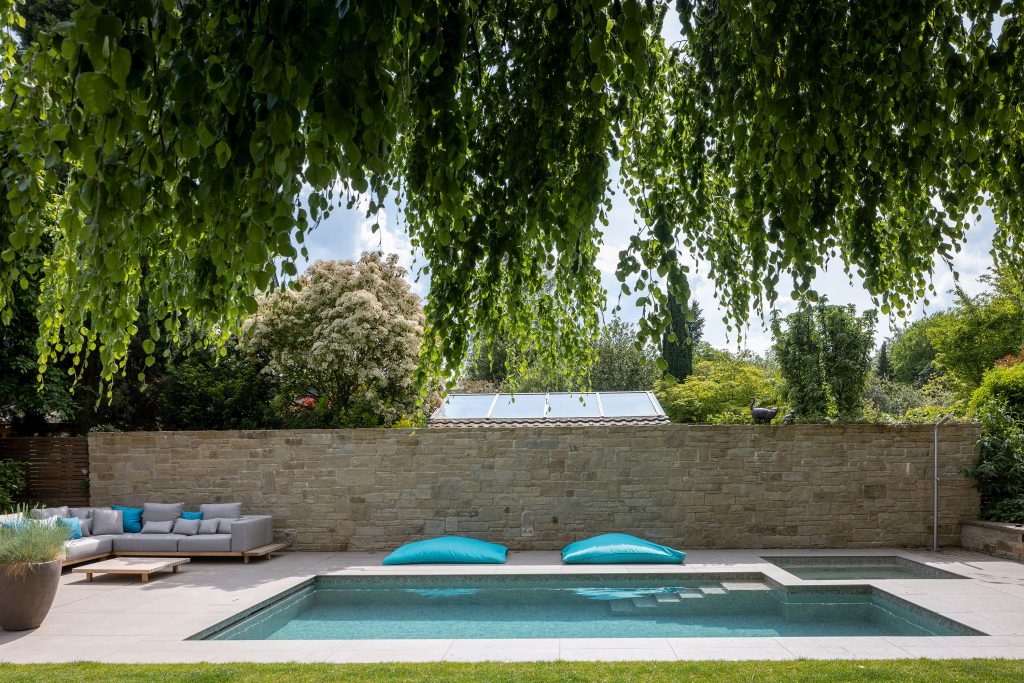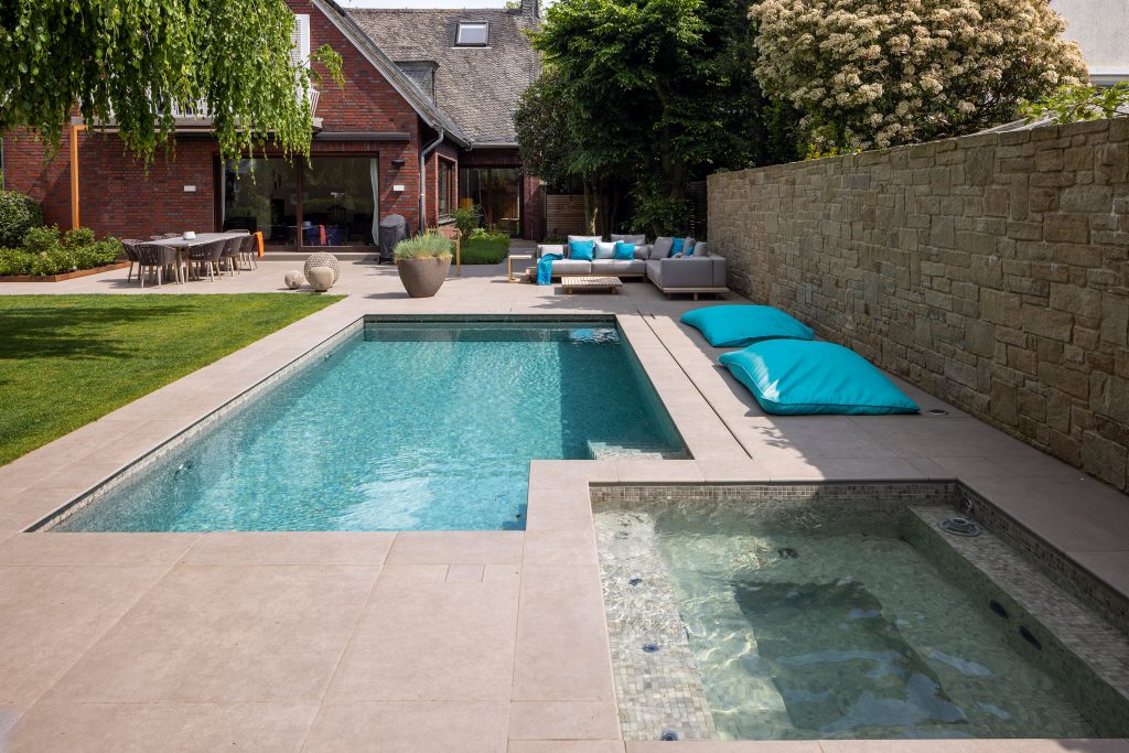 Visually, the mini pool stands out with its infinity-style overflow edge, which creates an attractive focal point even when the pool is not in use. Both pools are finished with Ezarri mosaic tiles, whose color tone resembles the natural stone surfaces surrounding the terrace and garden walls, creating a harmonious overall design.