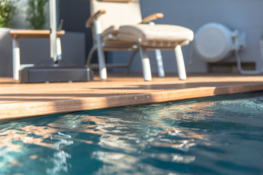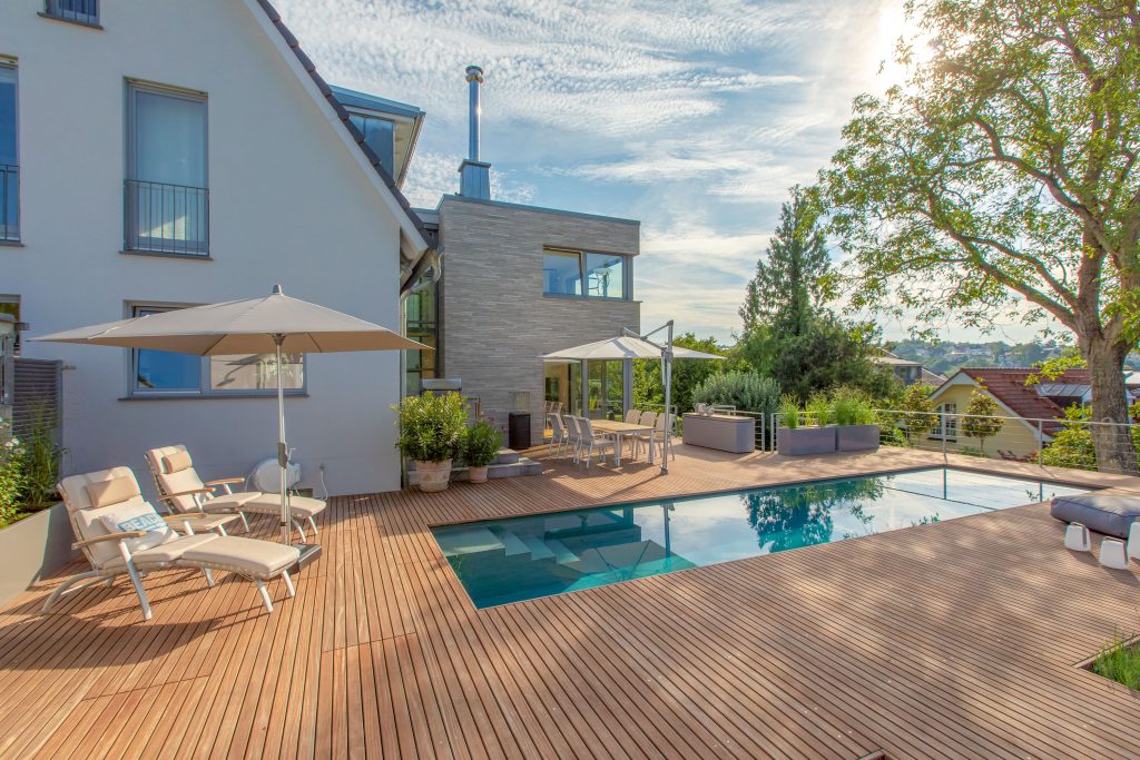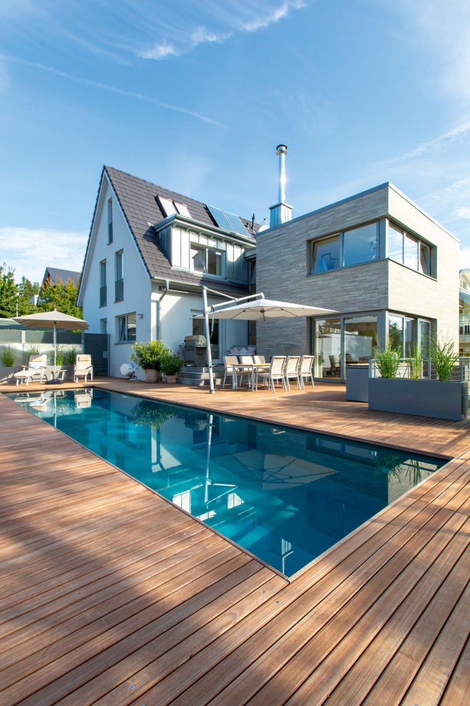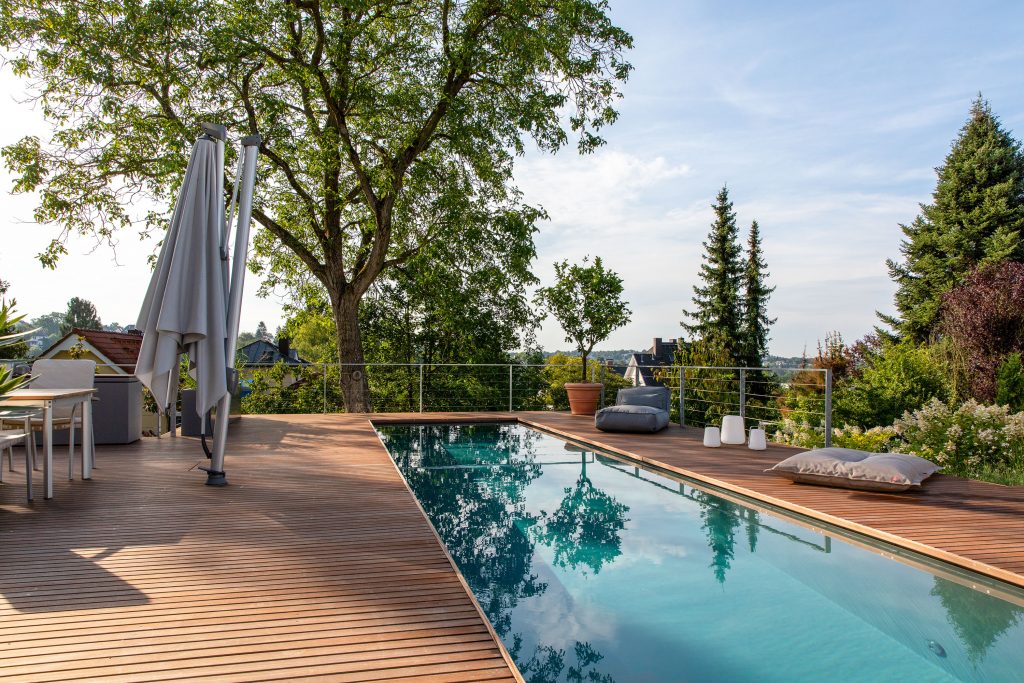 The minimalist appearance is further enhanced by the high water level and a discreet overflow edge. The surrounding deck conceals the gutter system, ensuring that the technical elements remain invisible and do not disturb the clean design.