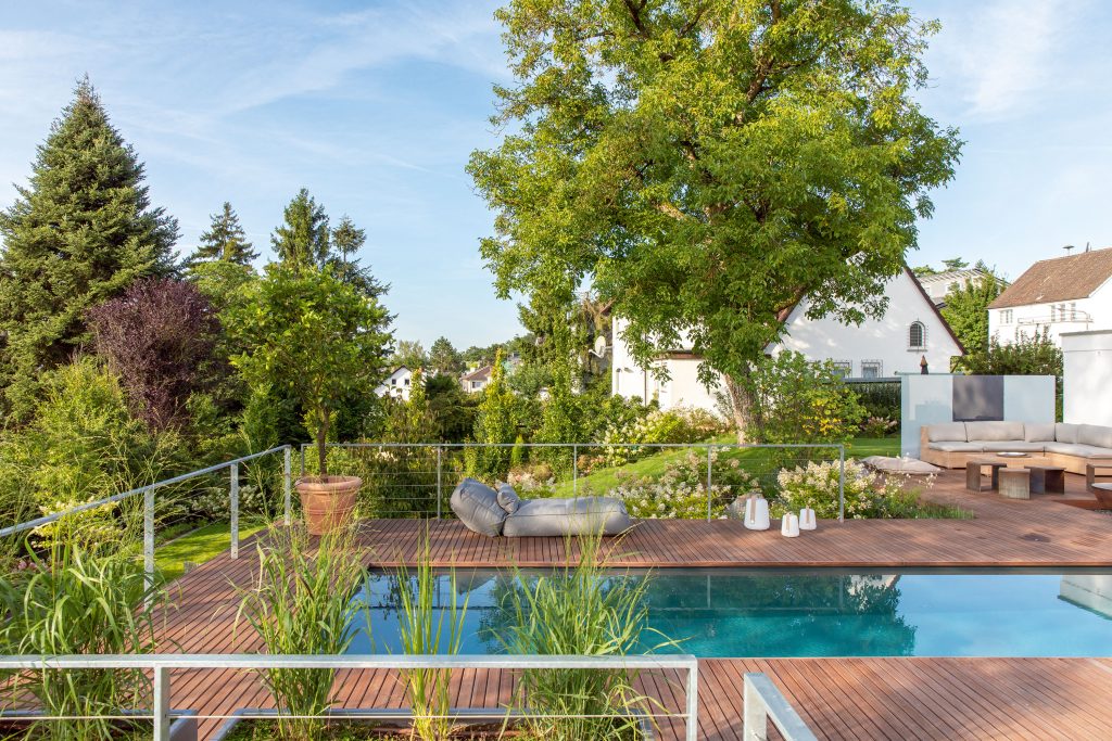 This setup also offers practical advantages: water loss is reduced, and swimmers enjoy uninterrupted views across the garden and into the distance—particularly impressive due to the sloping terrain of the property.