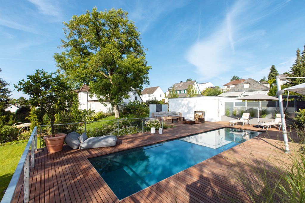 In the garden of a single-family home in the historic spa town of Wiesbaden, Pro Pool created an impressive swimming pool that stands out with its emerald-green water effect. This look is achieved by a pre-formed pool shell that appears slightly elevated, giving the impression of a jewel set within the expansive wooden terrace landscape.