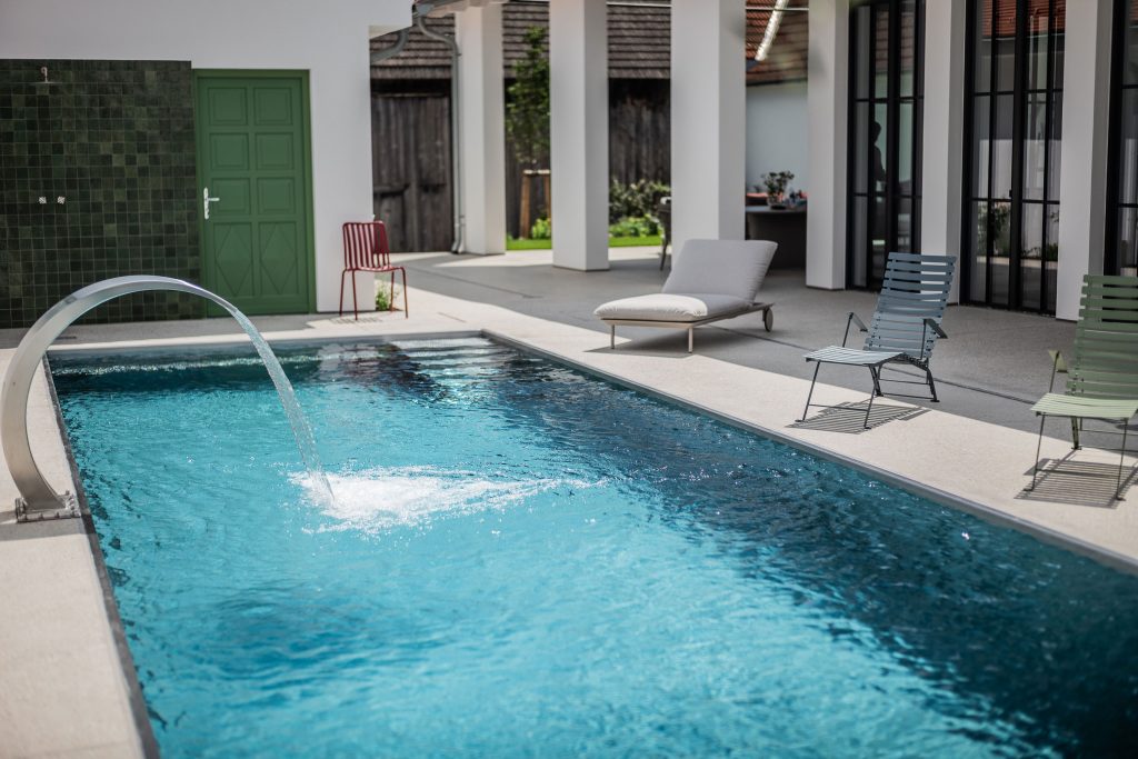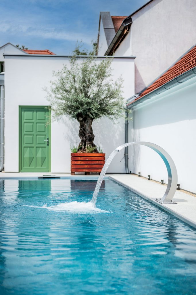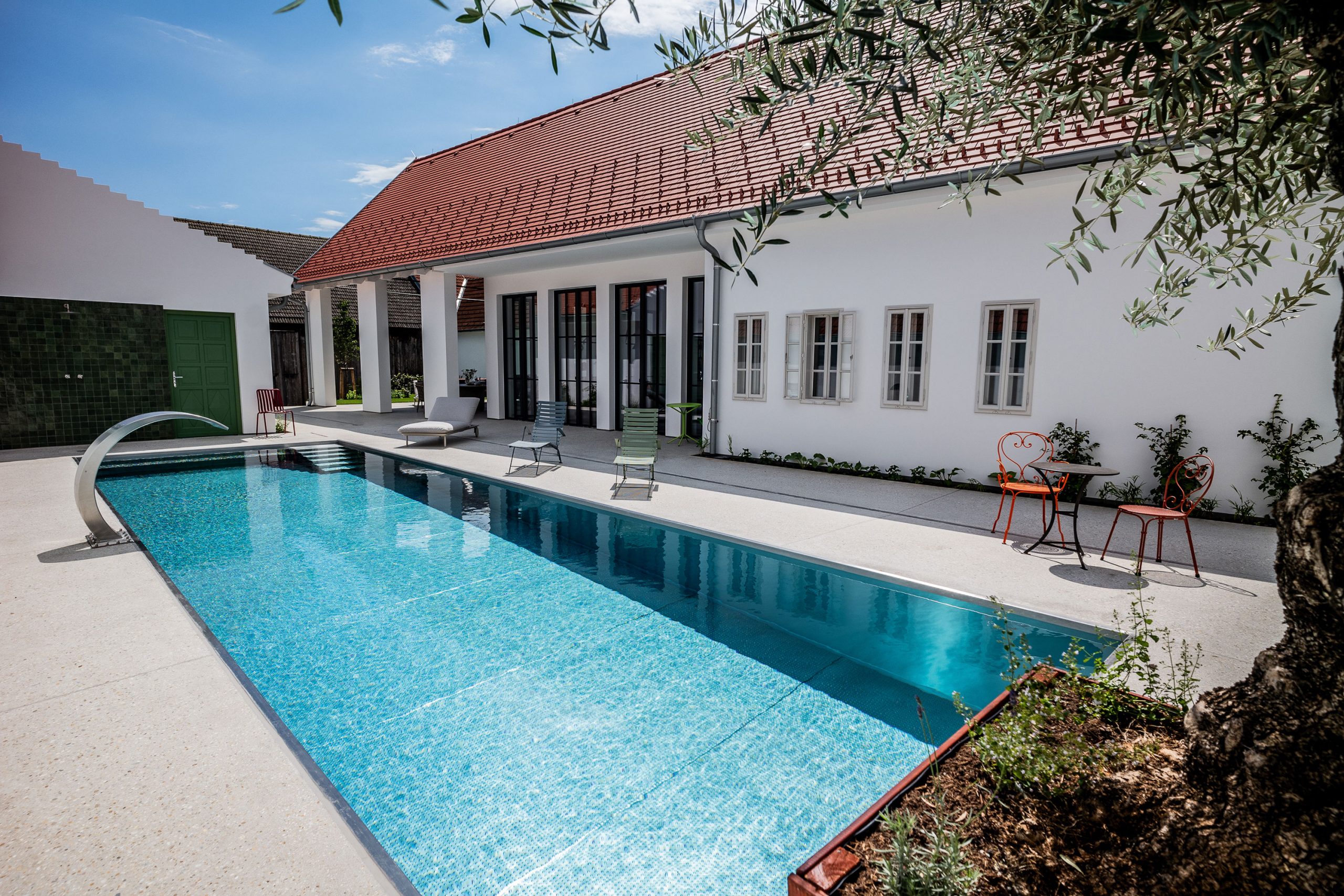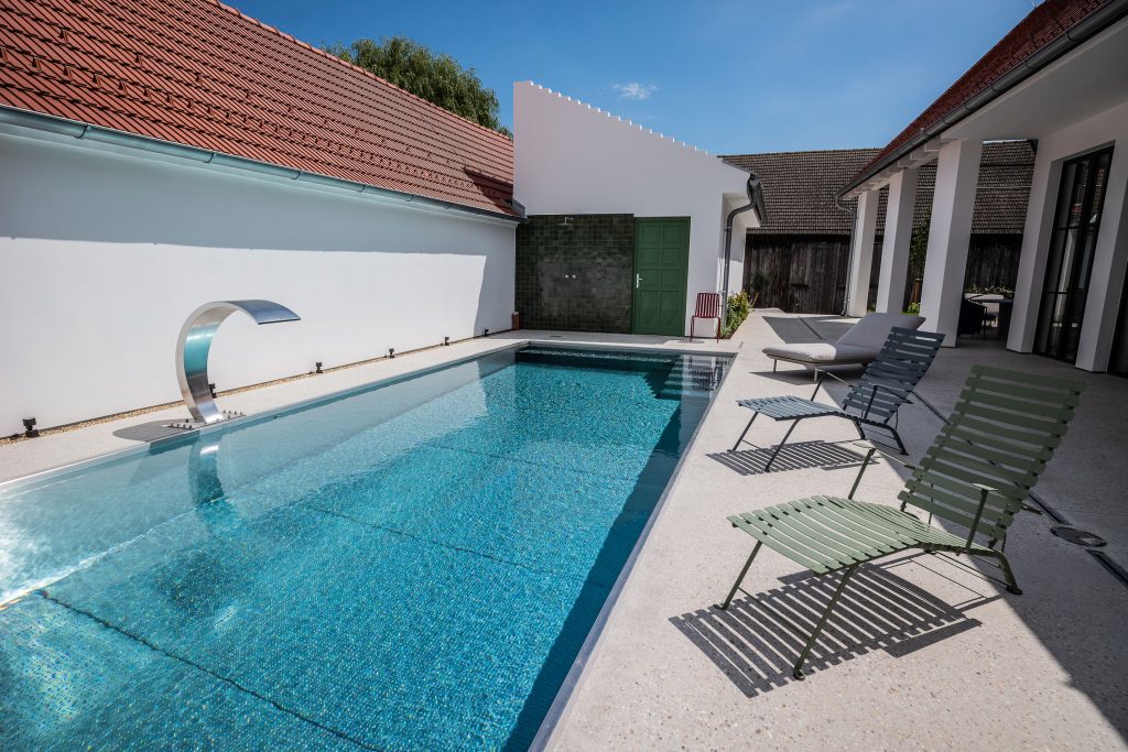 En Göttlesbrunn, Baja Austria AQA Steel Se realizó una piscina de acero inoxidable en el amplio patio de una familia vinícola, donde el trabajo y la vida se combinan de manera armoniosa. La piscina de 12 × 3,5 metros está protegida del viento entre los edificios circundantes y, en días cálidos, se beneficia de una atmósfera similar a la mediterránea. Este sentimiento se ve aún más intensificado por el diseño del entorno de la piscina, en cuyo centro se encuentra un impresionante olivo antiguo que sirve como punto focal natural.