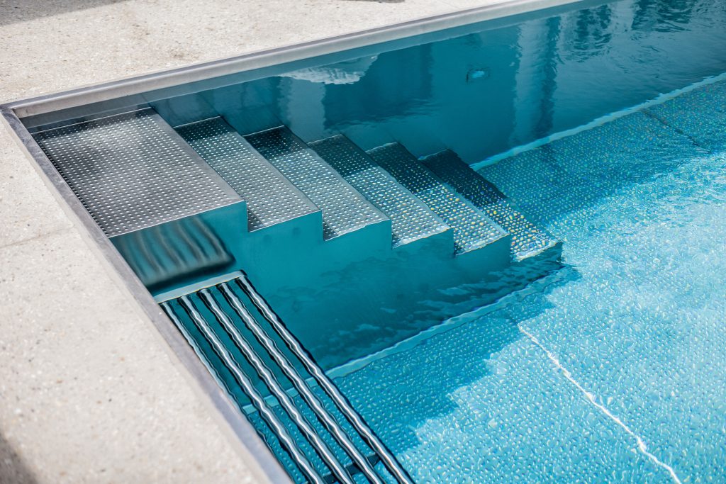 Una entrada con escaleras conduce a la piscina desde el lateral. Al igual que el suelo de la piscina, los escalones están hechos de acero inoxidable texturizado para ofrecer mejor agarre. Justo al lado, se une un banco tubular con una función de burbuja de aire integrada.