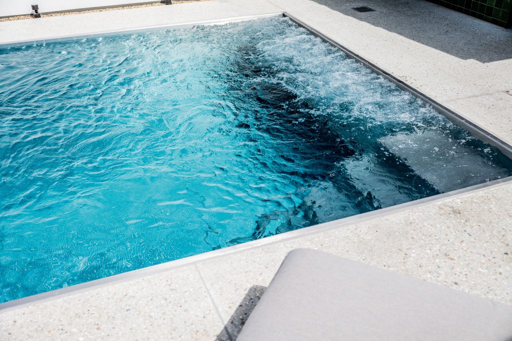 Justo al lado de los escalones, un banco tubular llena los 2.7 metros restantes del ancho de la piscina. Ya sea para enfriarse o relajarse después del entrenamiento de resistencia, el banco puede proporcionar burbujas de aire caliente relajantes gracias a la tecnología de soplador controlable.
