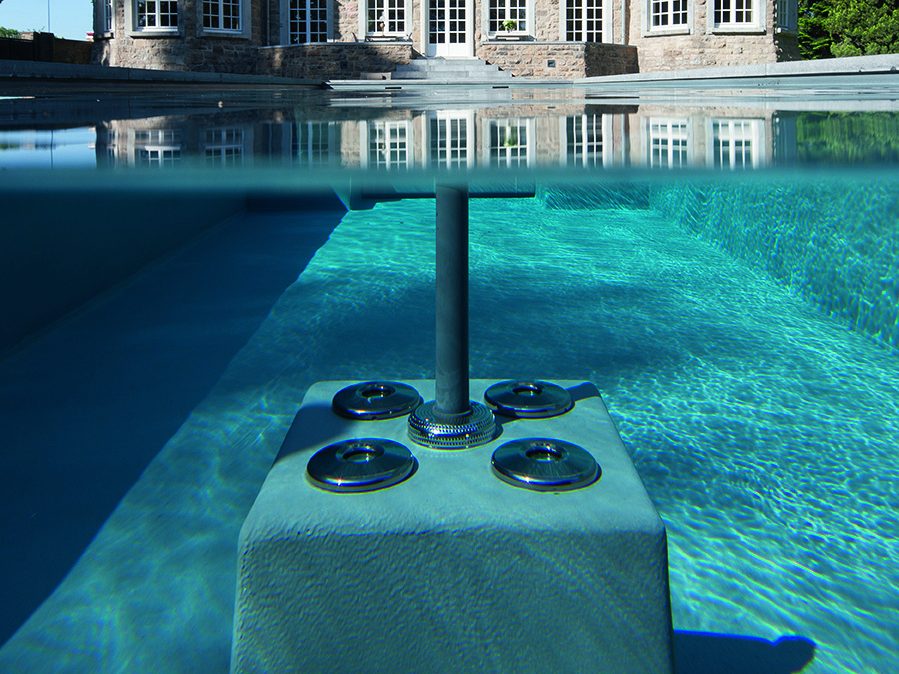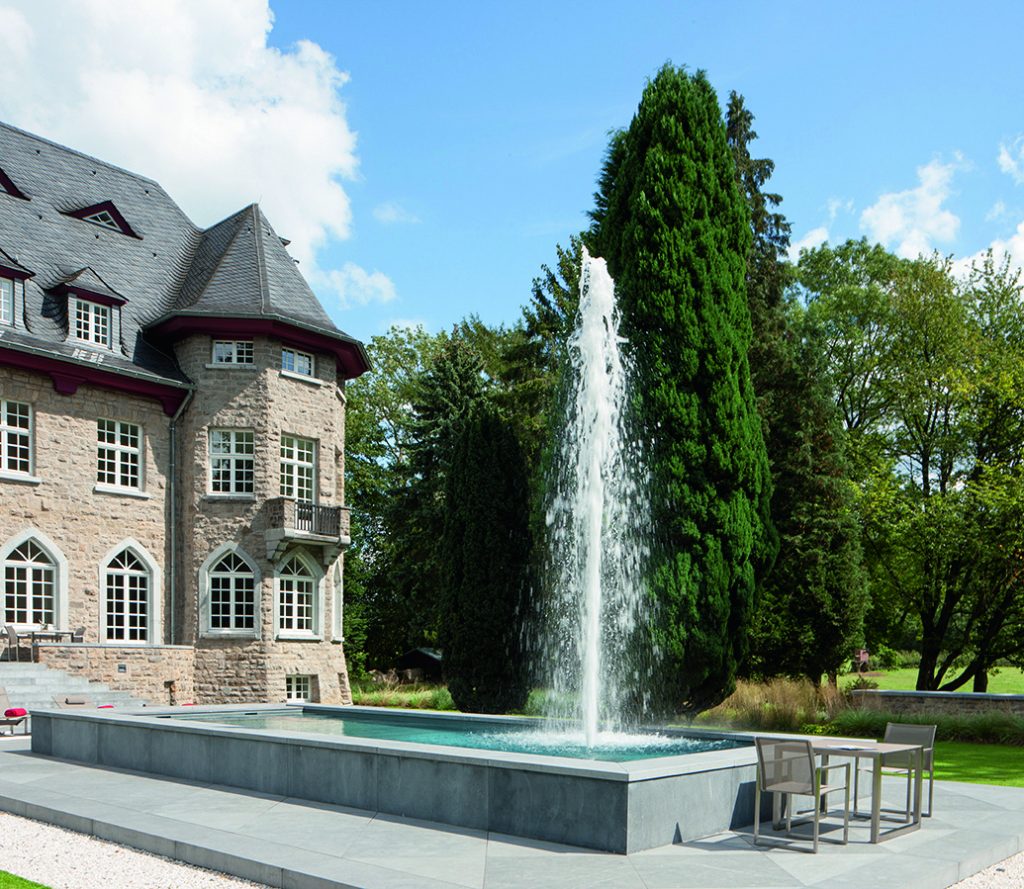In the center of the castle pool, a permanently installed water feature is integrated and supplied by a powerful Espa pump. In the evening, the magnificent fountain is staged by an LED spotlight illuminating it from below.