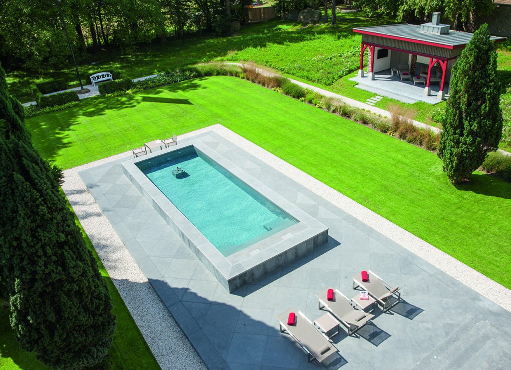 Another challenge was that beneath the pool area lies an underground garage of almost 1,000 square meters, making a ground-level installation impossible. As a result, a flush-mounted basin from the RivieraPool Individual program was chosen, which rises about 20 centimeters above the ground surface.