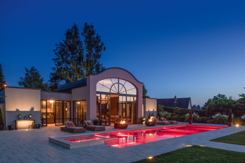 La piscina presenta una scala a cinque gradini che incorpora ampi sedili e gradini per il relax – il sistema a controcorrente è anch'esso integrato in questa struttura. Il colore grigio pietra della conchiglia della piscina fa sembrare l'acqua di un blu intenso.