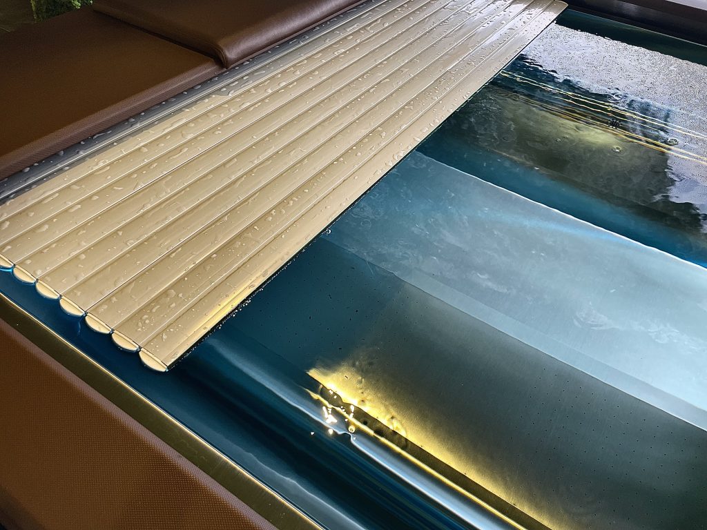 New to the collection is Miroir Design Roll, the version with an automatic cover. When the pool is in use, the thermally insulating roller shutter — designed to retain heat and strengthen the product’s sustainability credentials — retracts beneath a dedicated cushion, alongside the standard one that conceals the technical components.