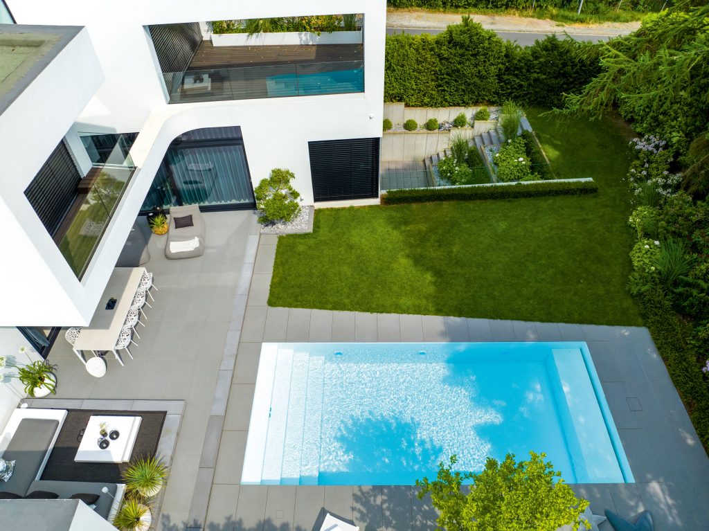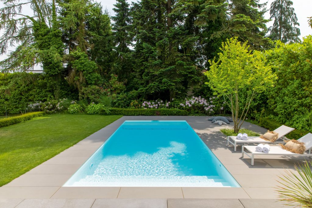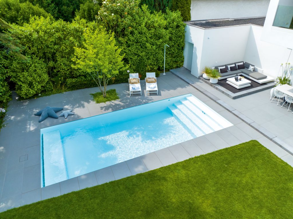 The pool is a Skimmer Invisible model by Niveko, whose dimensions were individually configured based on the predefined layout of the garden. With a size of 8.46 × 3.66 meters, it creates a particularly harmonious overall appearance.