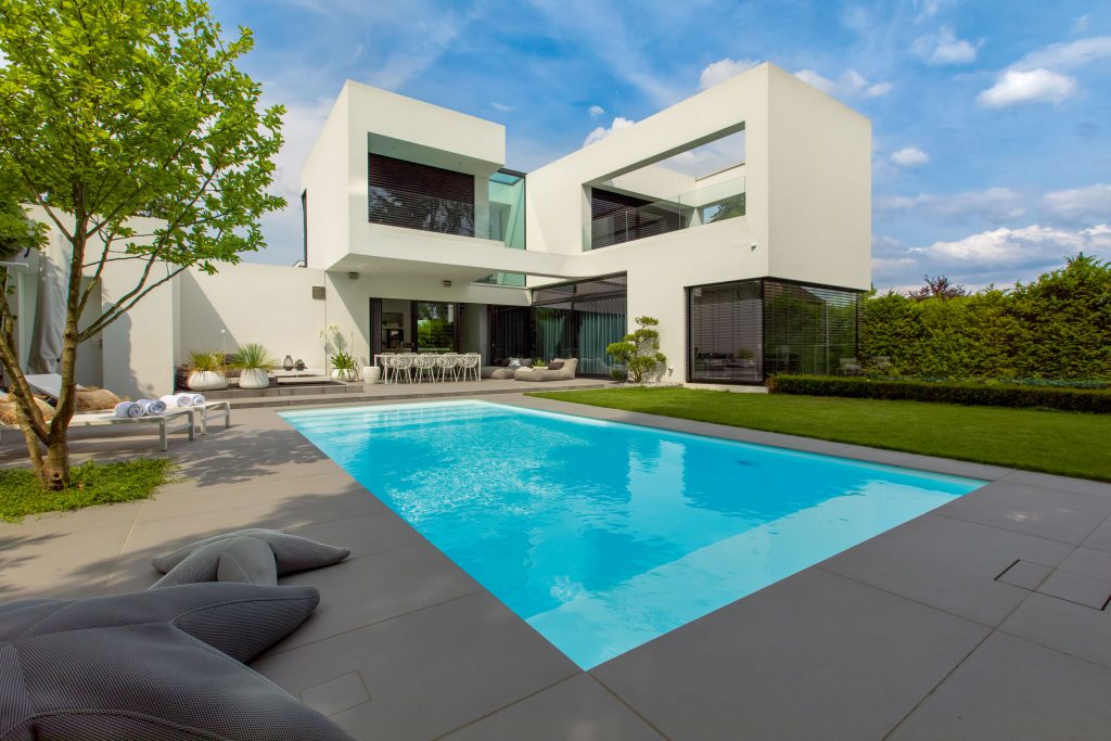 To achieve a perfectly balanced look, the pool was constructed with precise right-angled corners, matching the width of the basin and creating a clear, modern aesthetic. The pool interior is finished in white, giving the water a soft light blue tone that reflects the pale-colored base.