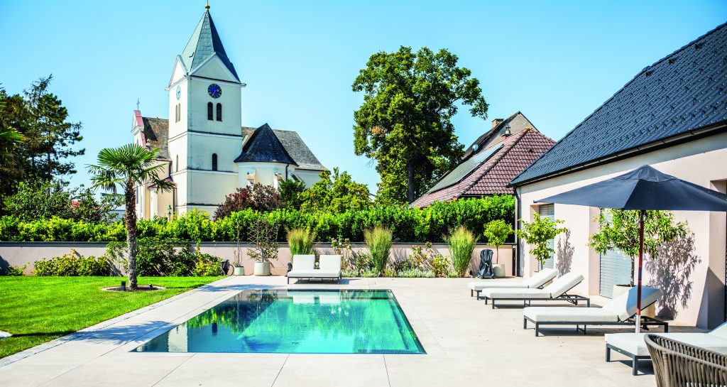 In Prottes in Lower Austria, the villa garden of an entrepreneurial family was enhanced during a renovation with a sleek 8 × 4 meter stainless steel pool by AQA Steel. The overflow pool is seamlessly integrated into the spacious terrace landscape, which transitions into a well-maintained lawn. Three palm trees planted within the lawn add a touch of holiday flair to the setting.