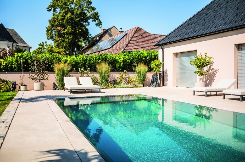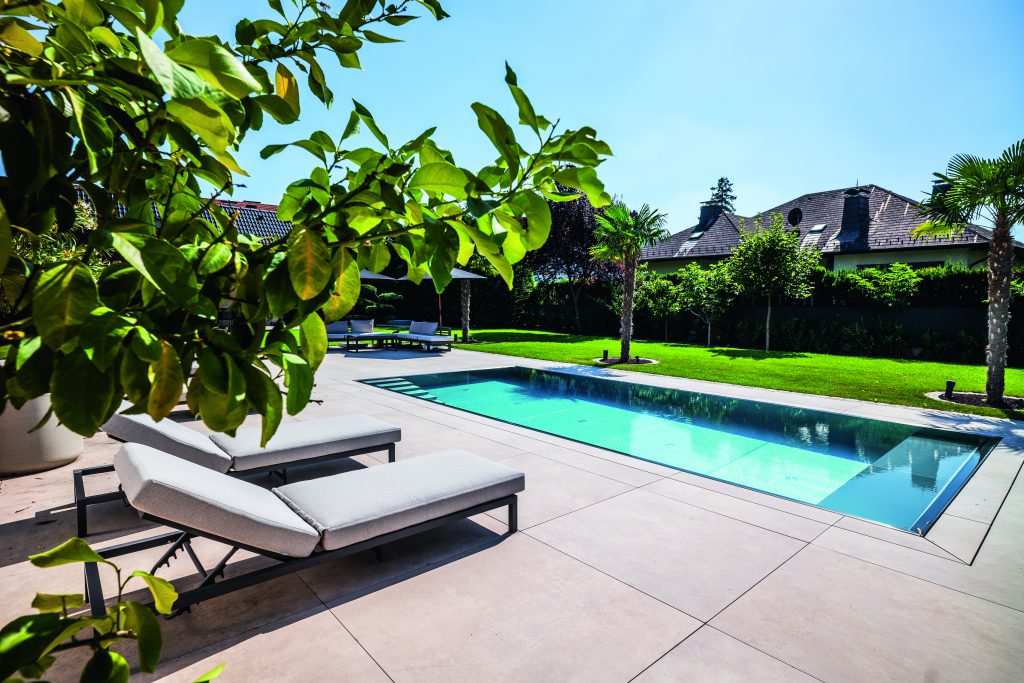 Although the pool features an overflow channel, the terrace paving continues right up to the water’s edge. This is made possible because the surrounding catch channel is covered with segmented panels made from the same stone slabs, effectively concealing it.