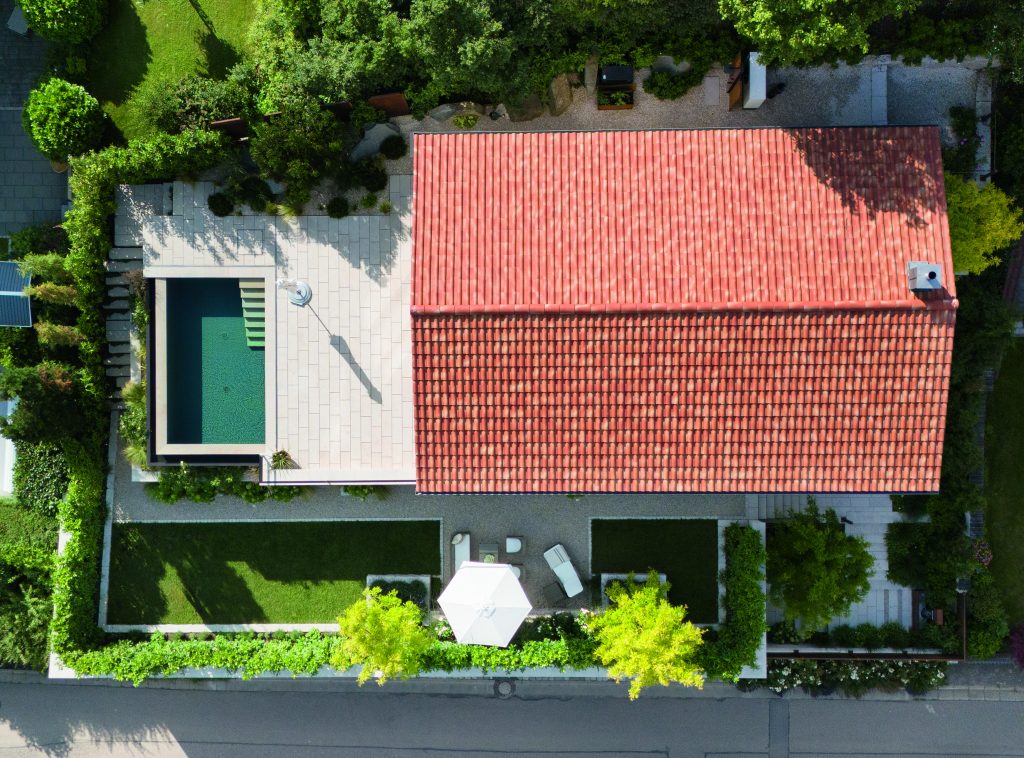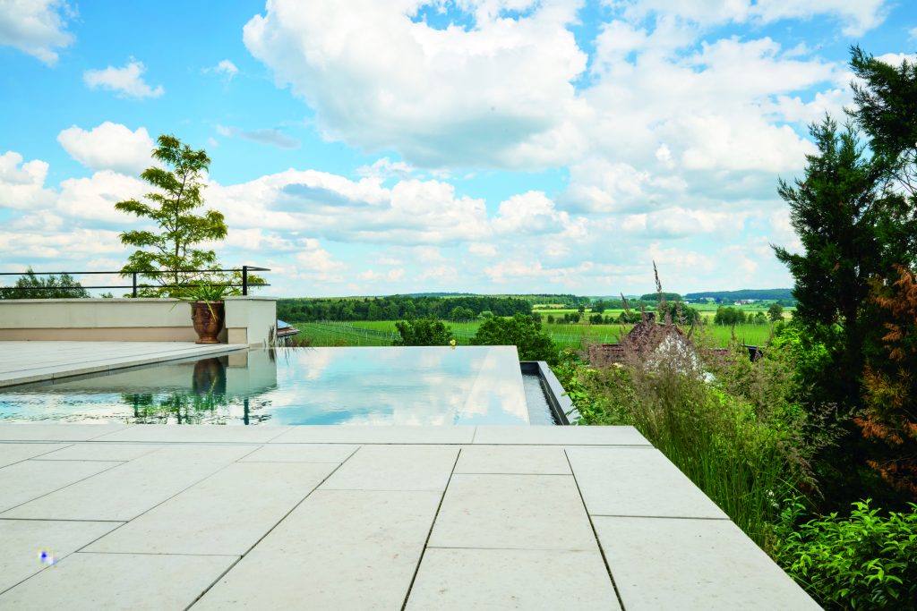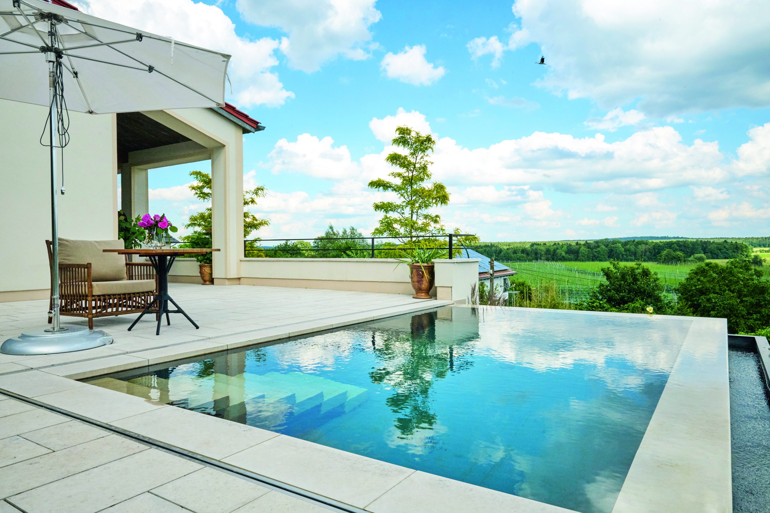 Het zwembad bevindt zich aan de rand van een terras dat is opgebouwd uit kalkstenen tegels uit Dietfurt. Het wateroppervlak, uitgerust met een natuurlijk zwembadfiltratiesysteem, ligt net onder de terrasbestrating, terwijl aan beide hoekranden het water vrij lijkt te stromen in de lucht.