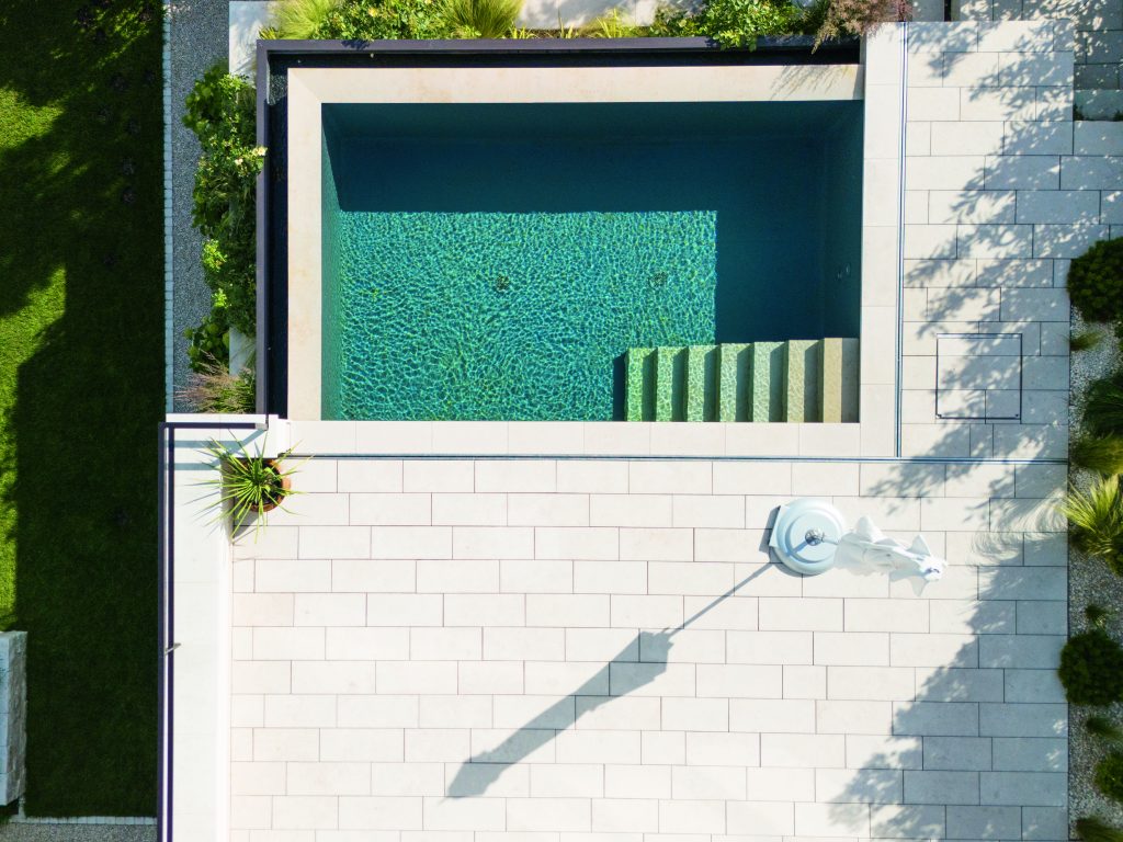 Dit visuele effect wordt gecreëerd door een verzonken overflowkanaal dat langs de rand van het zwembad loopt en het water dat over de rand stroomt, zachtjes verzamelt. Aan de onderkant van het zwembadterras vormt een decoratieve stenen bed een overgang naar het mediterrane tuinconcept, met planten zoals wilde tijm, distelachtige vaste planten en grassen.