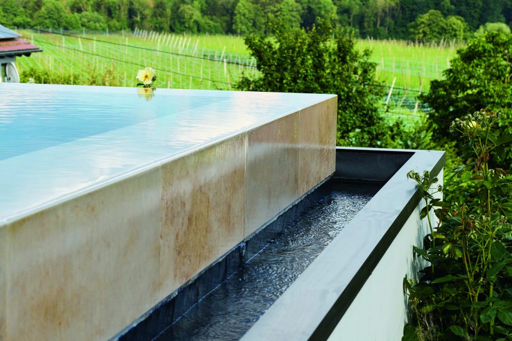 De infinity overflow bevindt zich in de buitenhoek van het zwembad en biedt dankzij de verhoogde positie een adembenemend uitzicht. Het overloopkanaal is bekleed met op maat gesneden natuurstenen platen die in de fabriek onder een hoek vooraf zijn verlijmd.