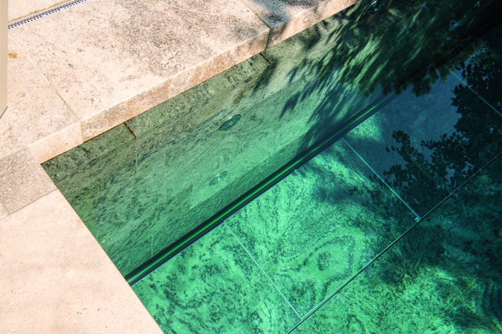 Designed for year-round use, the pool features a complete natural stone lining in a dark grey tone. This gives the water an intense emerald-green appearance that blends beautifully with the lush, richly planted garden landscape. Natural stone also forms the pool’s edge finish: generously thick stone slabs add another refined design element to the skimmer pool. Like the adjoining polygonal pathways and terrace slabs, they are kept in colors that harmonize with the architecture of the house.